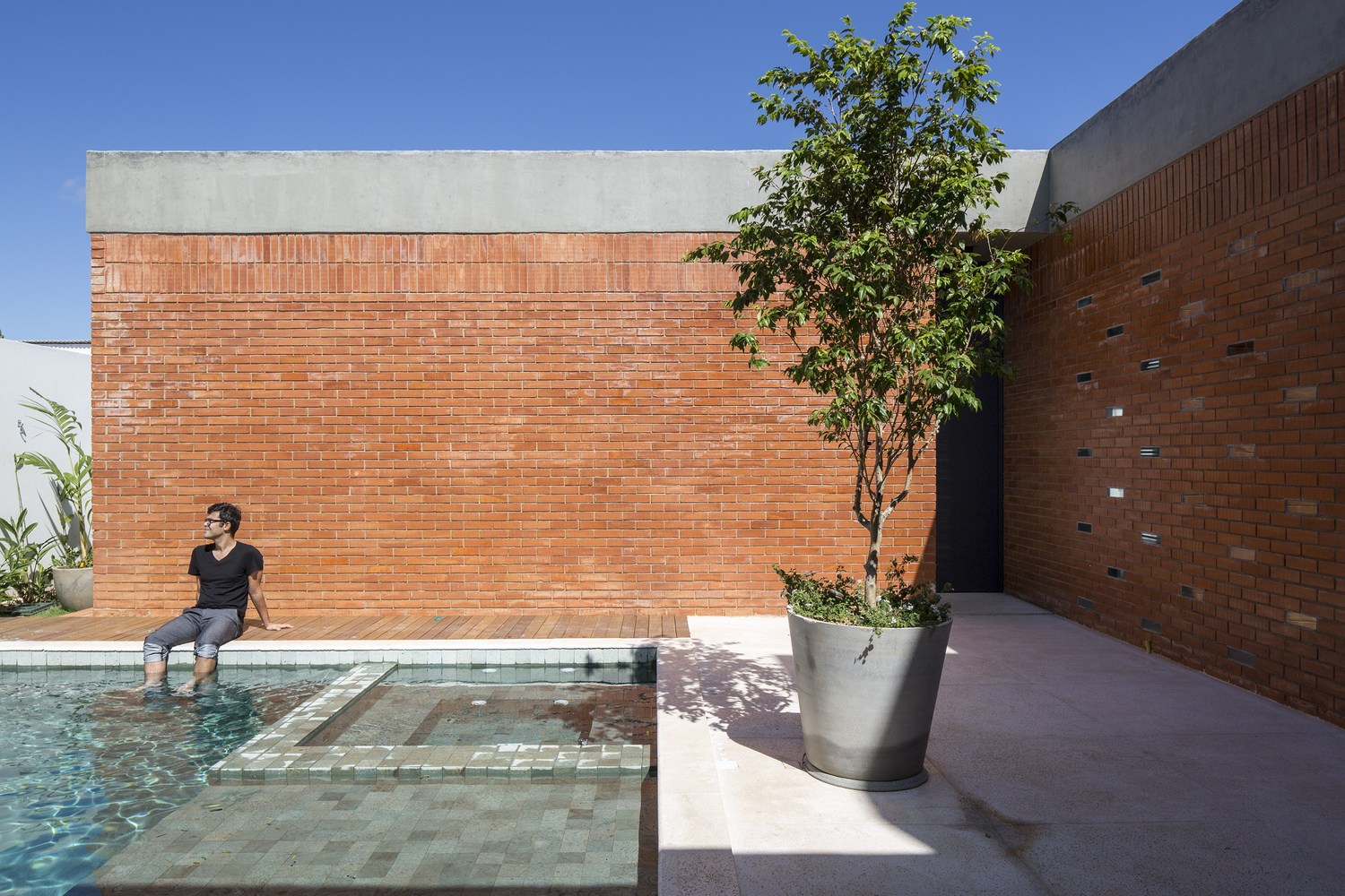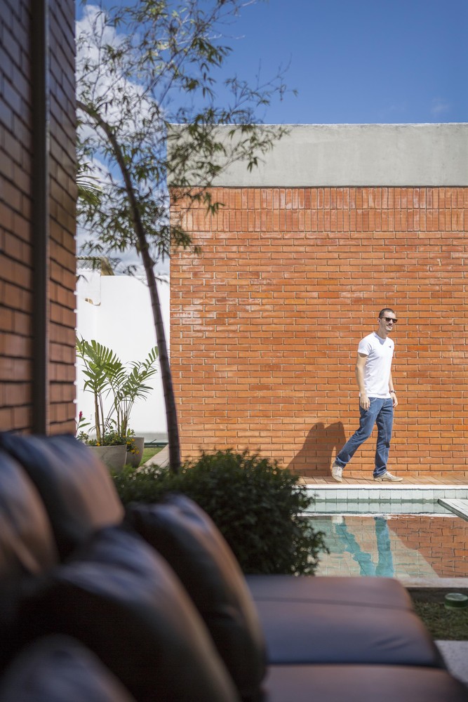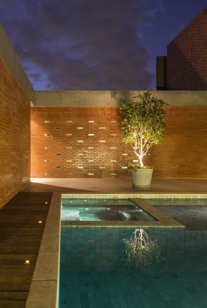 The solid brick wall has only a sealing function and has no structure or embedded systems. In the private hall part of the bricks were replaced with massive glass bricks, made especially for the project. These bricks bring natural light and allow small views of the courtyard. The sealing of the tower that houses water tanks and AC condensers consists of the same solid bricks, but their layout is like a “twist” that leaves empty spaces between the pieces and promotes natural ventilation and lighting.