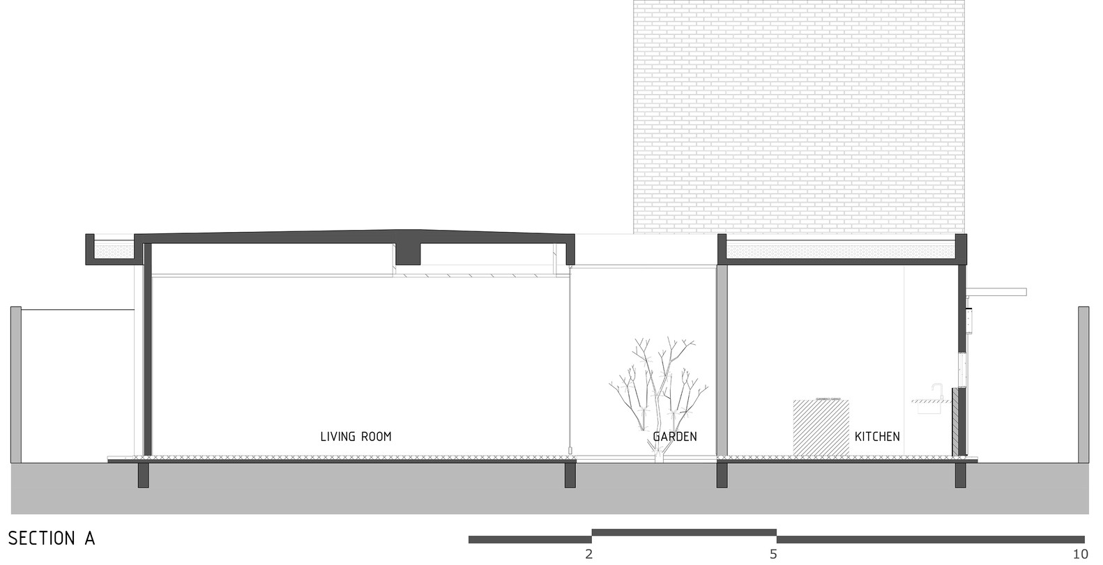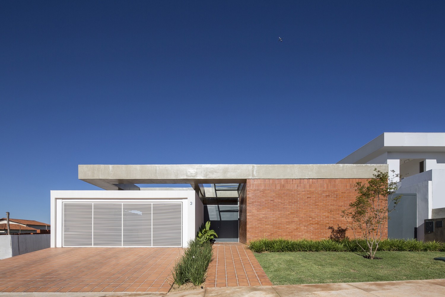 The painted brick walls assume the functions of embedding facilities and part of the concrete structure, and define the secondary spaces of the house such as side walls and garage. The concrete beams are exposed around the entire exterior of the house, crowning the composition. The concrete pillars are sometimes exposed along the walls of solid brick, sometimes embedded in the masonry walls.