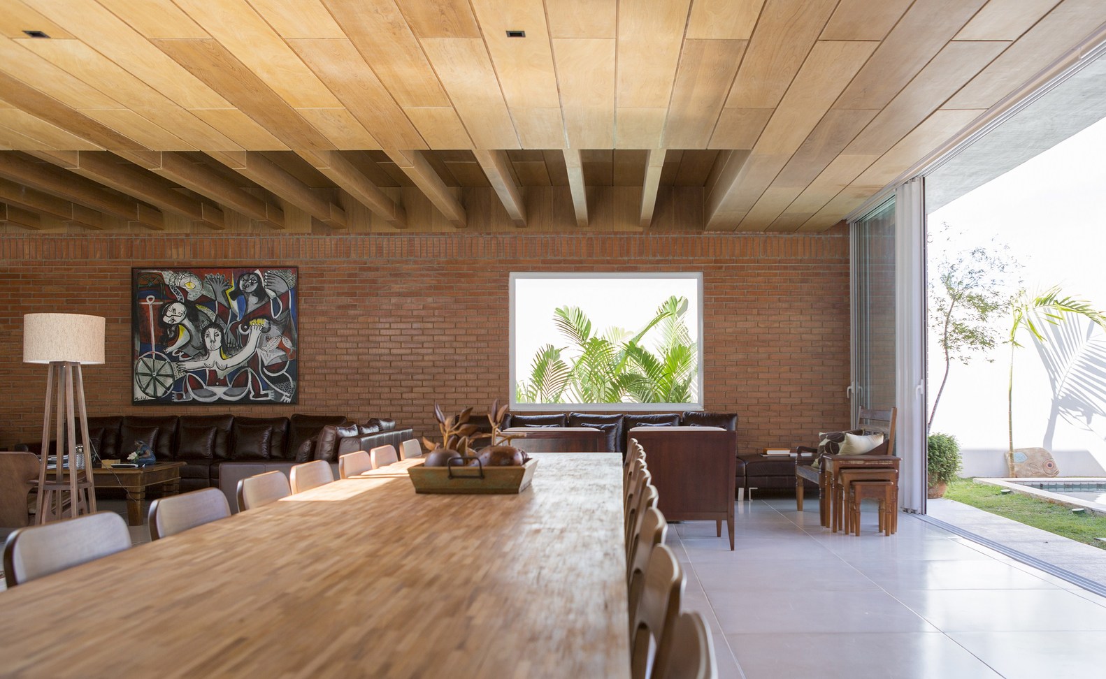 The natural wood cladding (tonka bean) in social areas is a surface structured internally by wood and steel beams. The cladding contains air conditioners, facilities and lighting in the dining table and circulation areas. In the sofas and armchair area the cladding is higher, directly on the ceiling and leaving exposed parts of the beams of its internal structure. These beams form a pergola where the indirect lighting system is fixed.