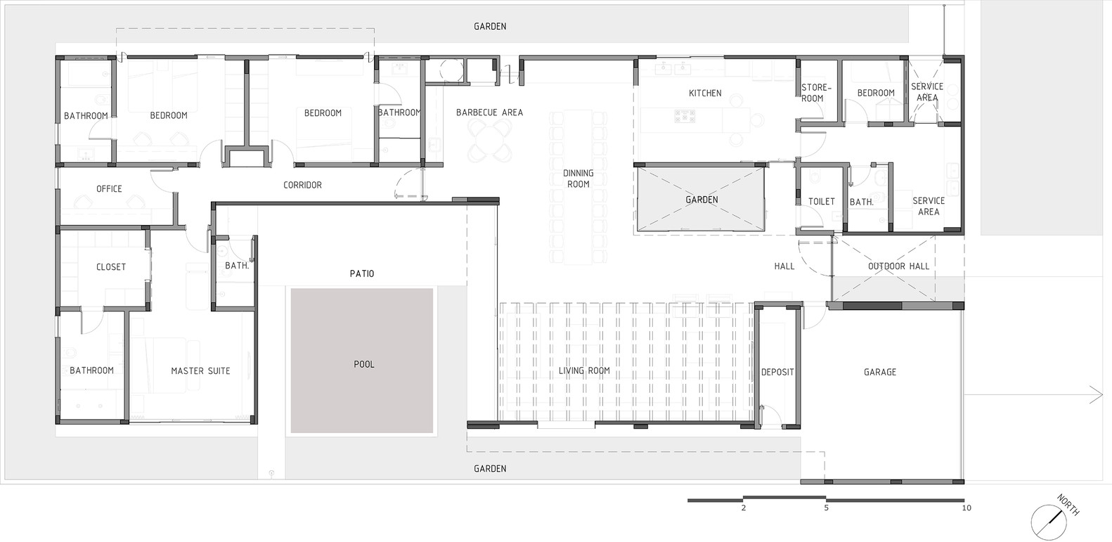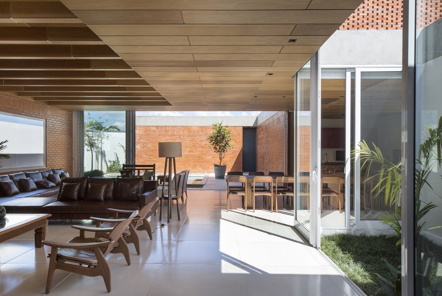 The site is located within a gated community in Brasilia, outside the urban context of the city and flanked by other houses. We use the highest occupancy rate allowed so as to enable the deployment of the house on a single level, as per the desire of the clients. We explore the views for the interior spaces of the site and create a central courtyard around which revolve the programmatic spaces. The living areas are open directly onto the courtyard, while the bedrooms turn their backs on it and open to the side of the lot. The social rooms of the house are organized in a continuous space, organized by an open central garden.