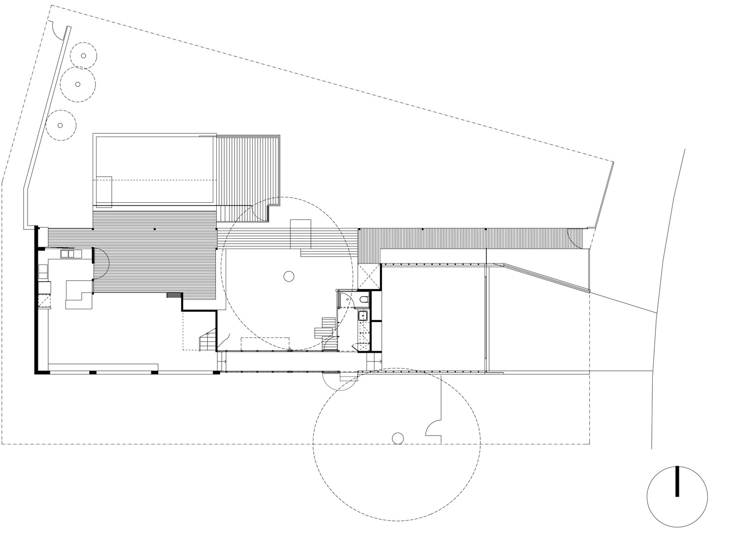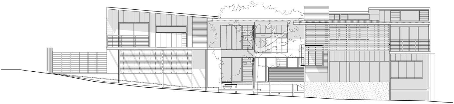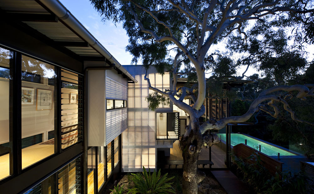 On approach from the street, the sloping terrain naturally guides an axial timber boardwalk under a simple timber pergola structure arriving in the courtyard opposite the Moreton Bay Ash. The main pavilion to the west accommodates living spaces focused around a double height deck space overlooking the swimming pool and northern garden. The Master Bedroom suite is accessed via a polycarbonate clad stair tower that is by day a contemplative space and by night, a lantern. The Moreton Bay Ash casts shadows onto the polycarbonate further animating the edges of the courtyard and bringing the landscape inside the house. The recent additions of a study ‘pop out,’ enclosed passage link below the bridge, Laundry and Powder room further animate the edges of the courtyard space whilst responding to the needs of its new occupants.