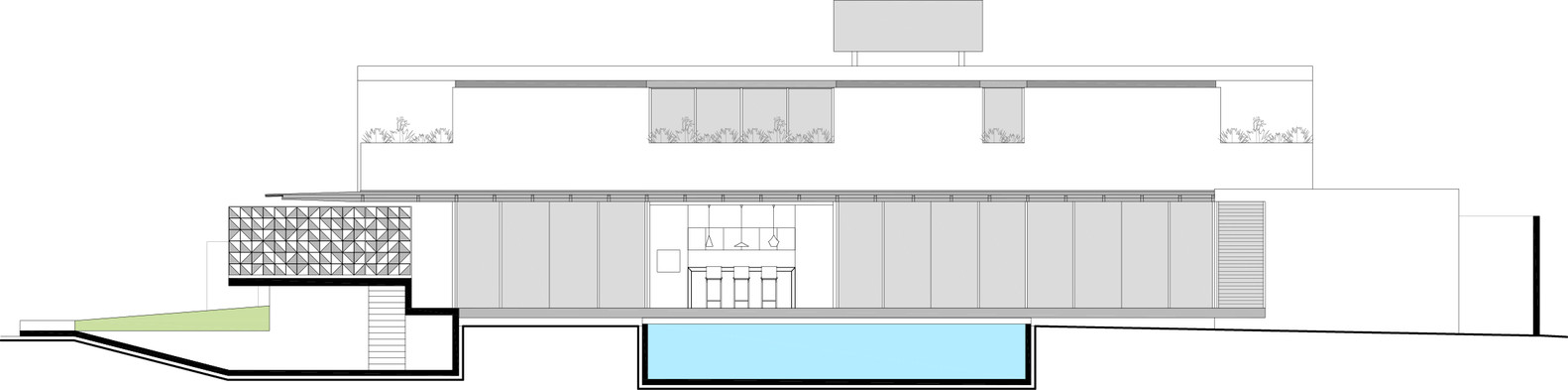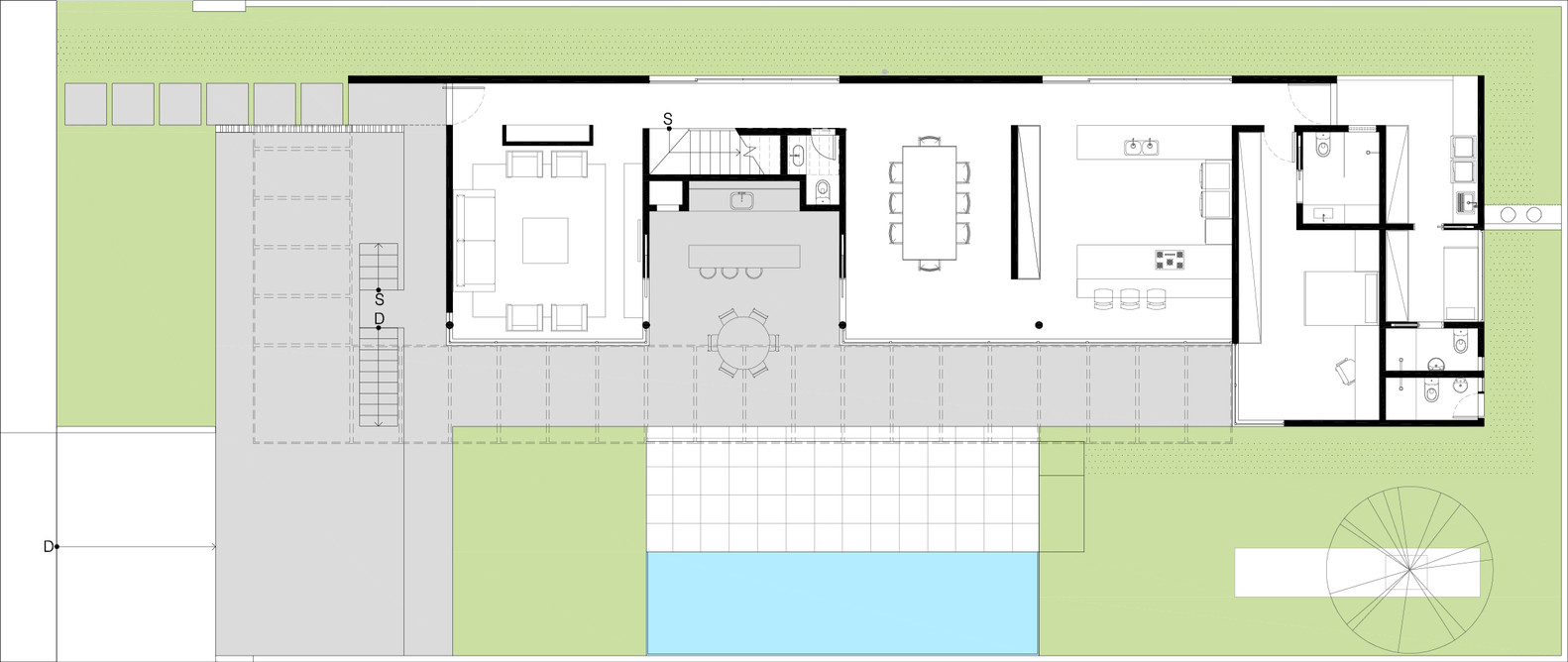 A sequence of contained environments within a structural modulation of 5.2 meters defined the social and service areas on the site, and the private spaces on the upper floor. The position of the garage on a semi buried floor enabled a terrace on the roof that defines the interaction between the public space and the privacy necessary for the pool. A large metal pergola provides the necessary shade to the balcony of the pool and the afternoon conversations on the terrace of the garage.