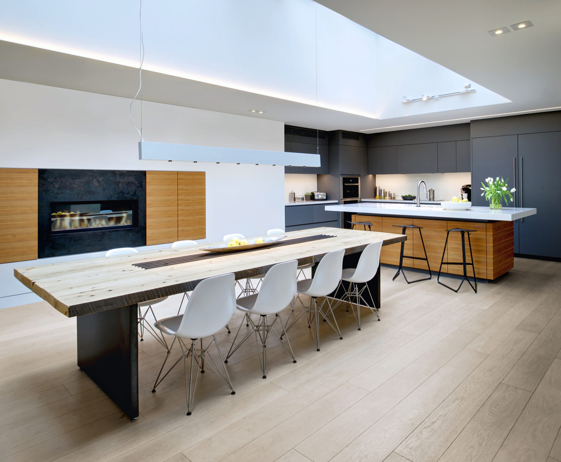Located directly on a busy Toronto thoroughfare, the house provides shelter from the street, with only a few, carefully placed windows. A long hallway leads to the protected interior foyer, where the home opens up to the sky with a quiet, light-filled interior that belies the building’s location. The main spaces are organized around an interior courtyard and a series of large-scale skylights that help to stream sun into the depths of the building, while retaining a great amount of privacy.