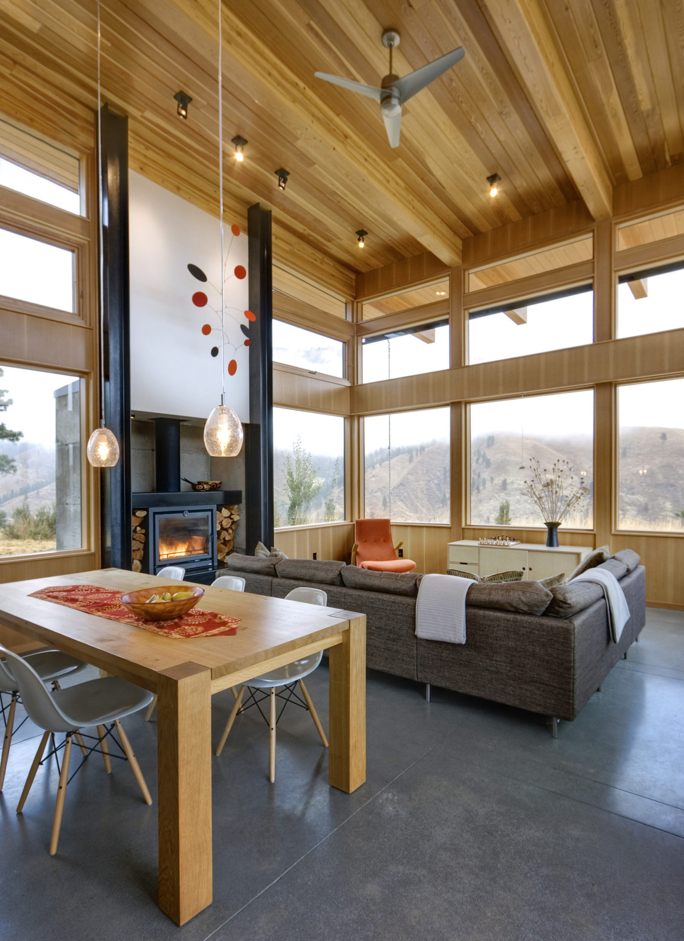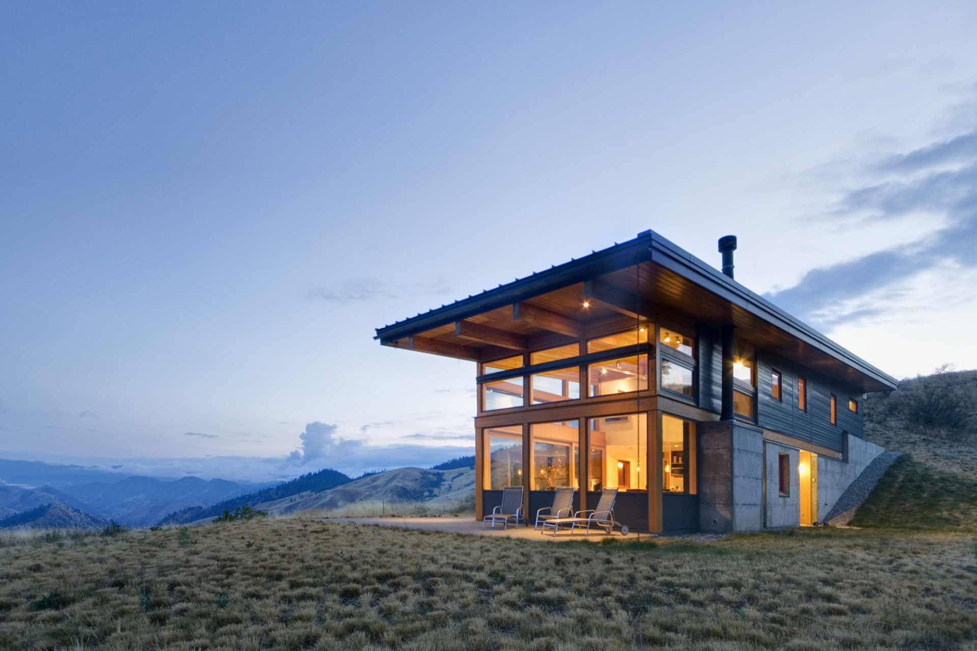 Its east west longitudinal axis and generous overhangs are designed to take advantage of solar orientation while maintaining panoramic views.