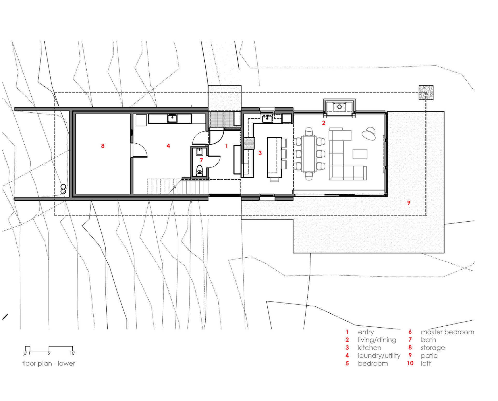 An eastern oriented living space and kitchen occupy most of the main floor along with a powder room and utility area located within the hillside portion of the home.