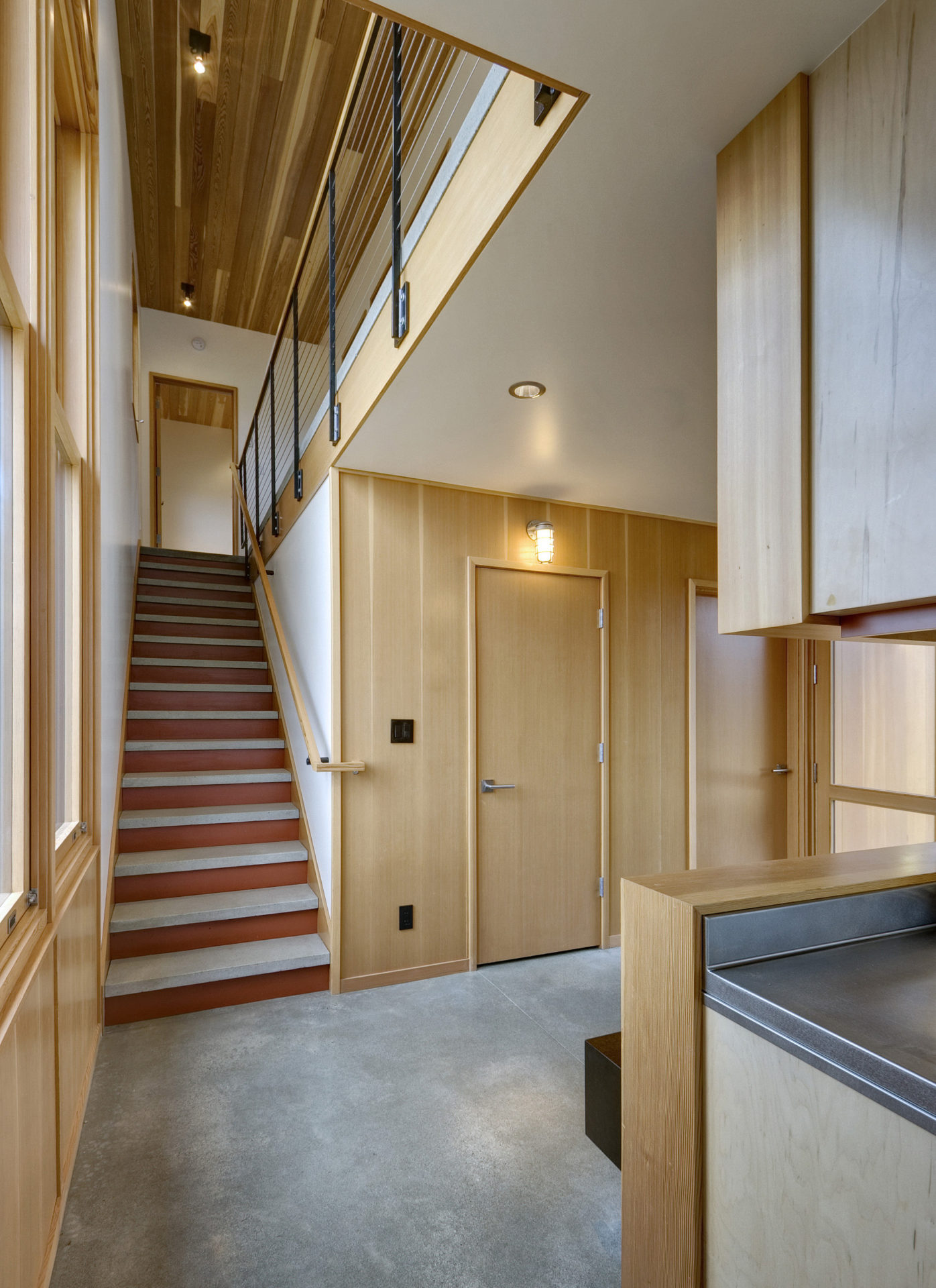 The main entry is a two story room with full height glazing on the north and south walls that frame the most dramatic down-canyon view.