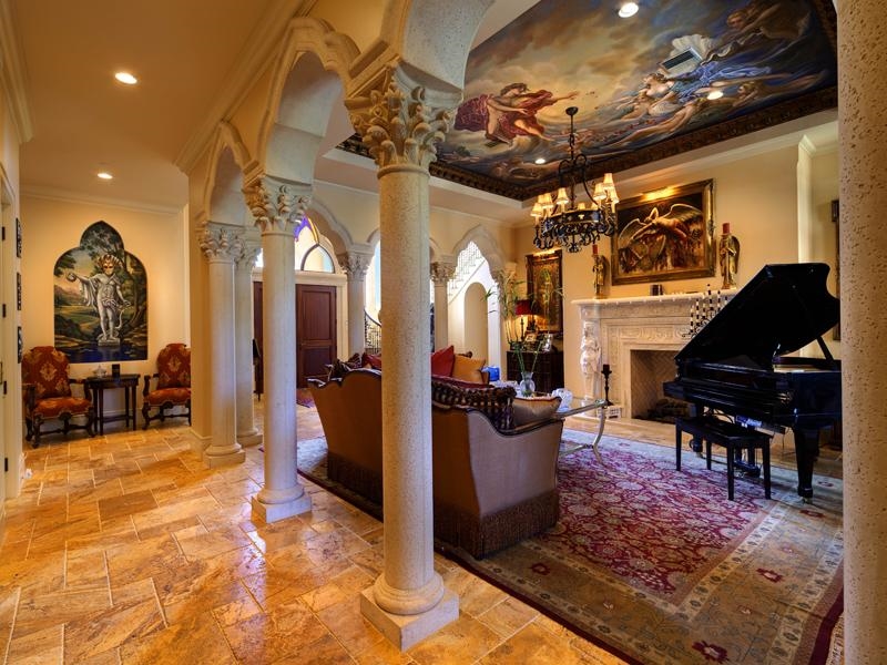 It features four bedrooms and an amazing master suite, five full/four half bathrooms, spacious living/dining quarters, a lush kitchen, a home theater/media room and a two story office emphasized by elegant stone, stained glass, wood and painted murals.