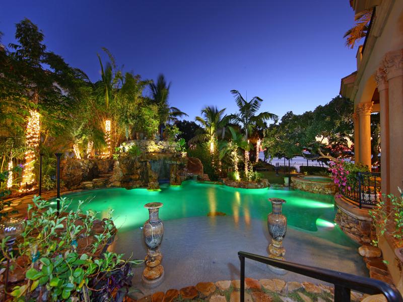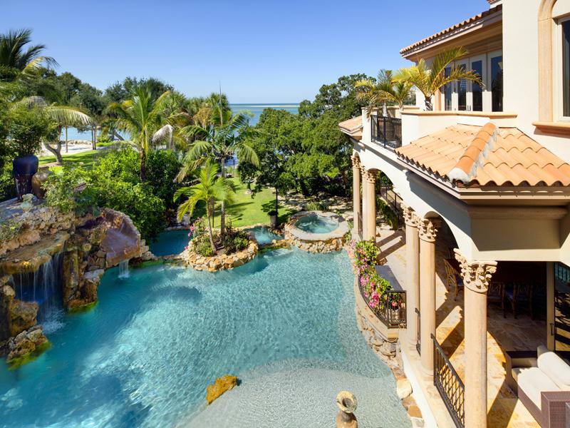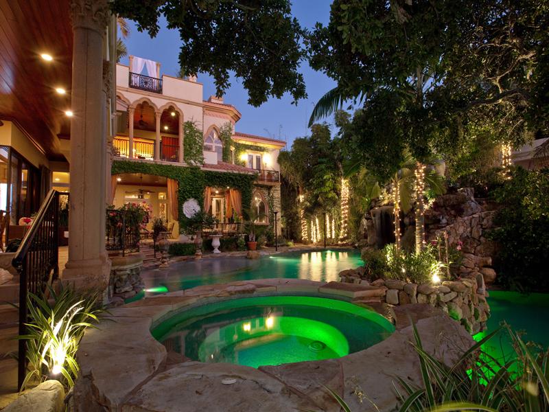 The outdoor area is absolutely spectacular due to the eight open porches and patios, a gorgeous rooftop garden/terrace, a bar area which can be accessed by elevator, an incredible swimming pool with waterfall, a cabana, a lounging area, a spa, a slide and a stage arranged for live entertainment.