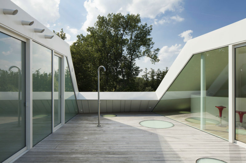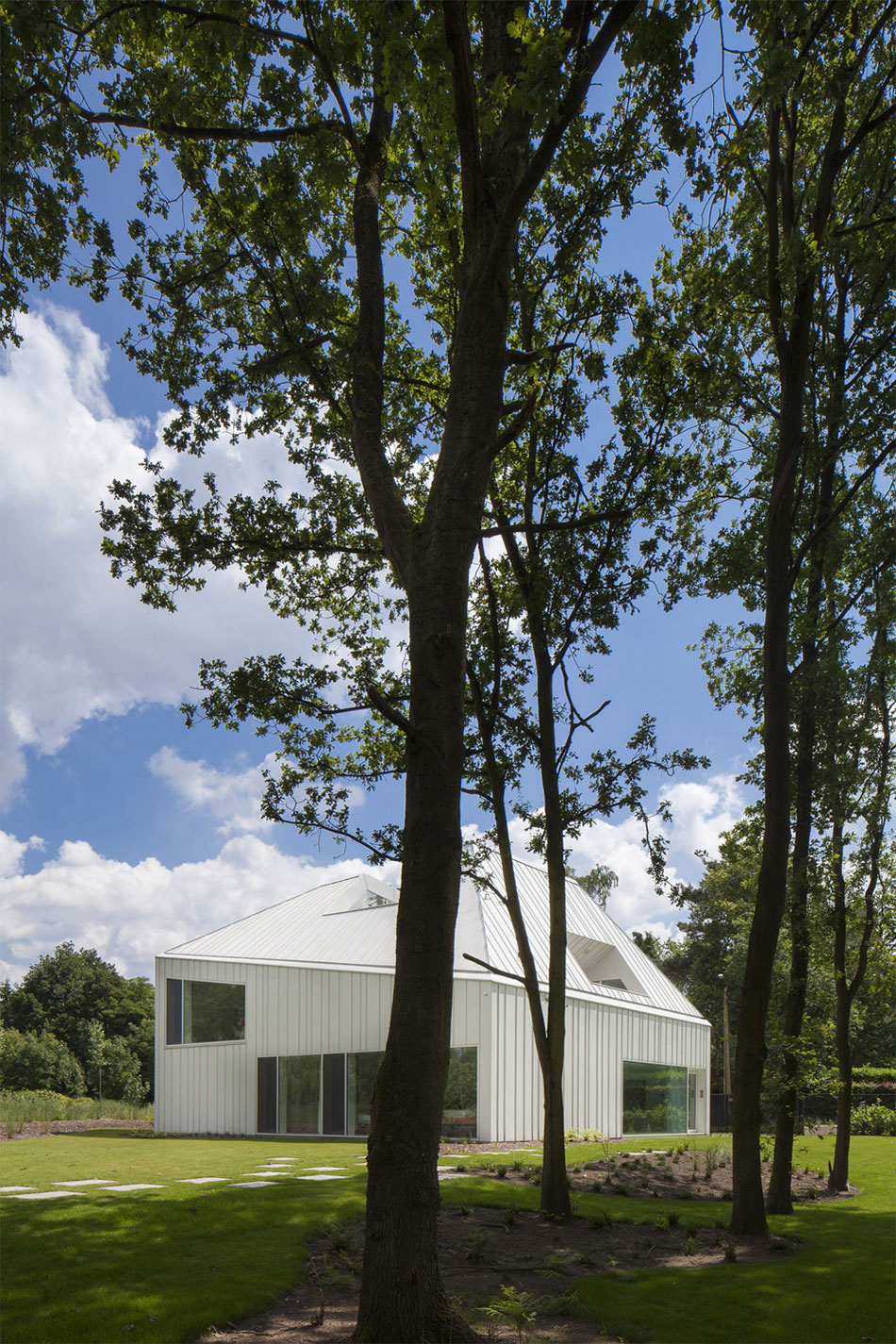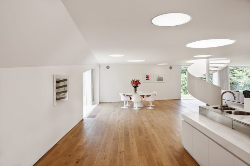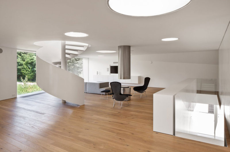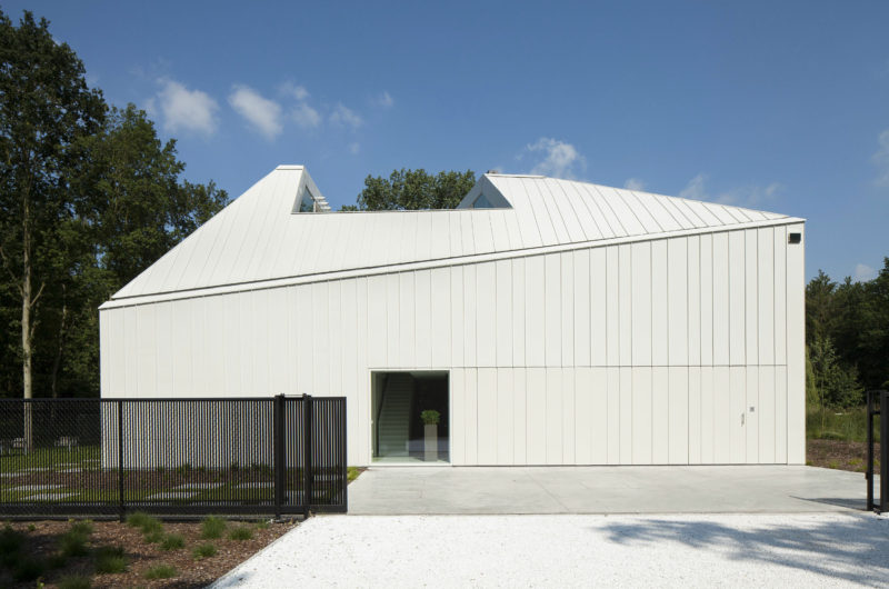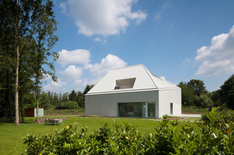The House VMVK has a strange shape but it impresses by originality. It is located in Sint-Katelijne-Waver, Belgium and was designed by dmvA. The walls are colored in white in order to create a contrast with the wooden floors that give the interior a homey aspect.
