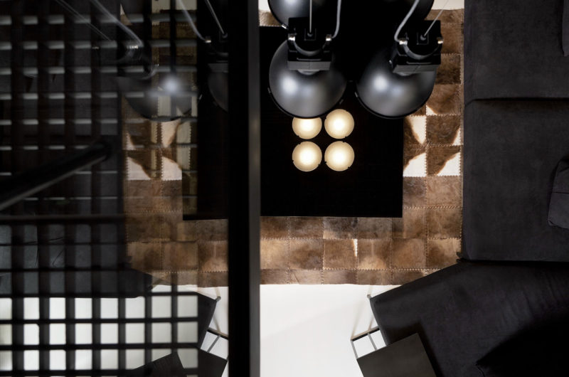 The exposed brick wall extends from the kitchen all the way to the living room, which features a much larger TV, a fireplace, comfortable seating arrangements and a coffee table. The living room can be admired from above from an elevated volume, which can be reached via a floating staircase.