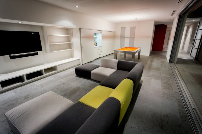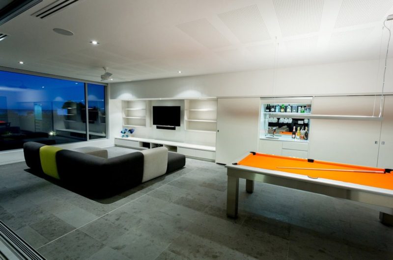 On the inside, a spectacular mix of high quality materials and contemporary décor elements blend into a remarkable display of warmth and comfort even though the home itself gives off an unmistakable feel of modernism. Furthermore, the crisp white walls of the P048 home are balanced by a carefully chosen array of colors that include bright orange shades for the pool table and carpets as well as yellow, green and beige for the chairs and sofas respectively.