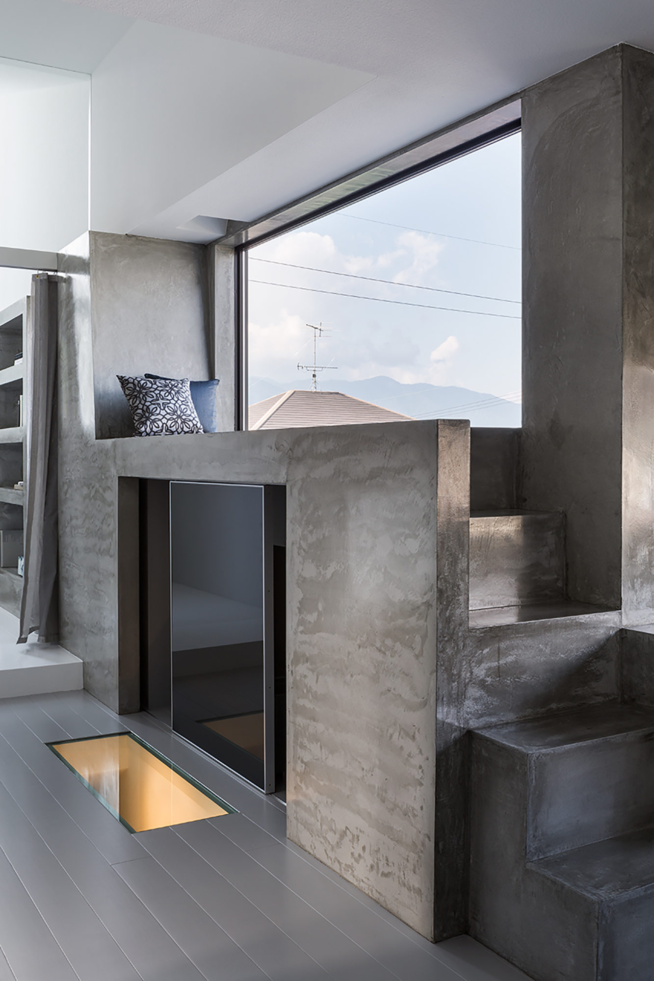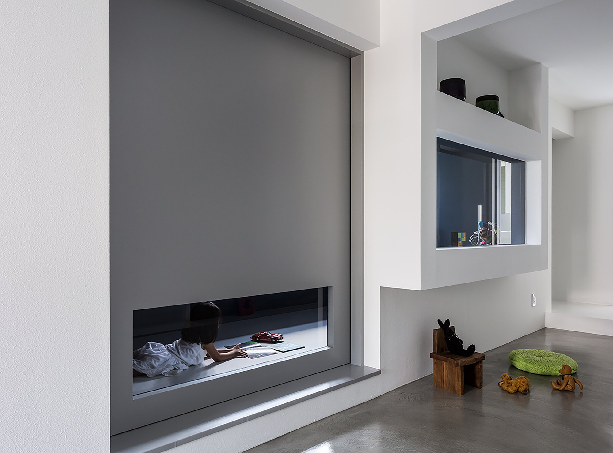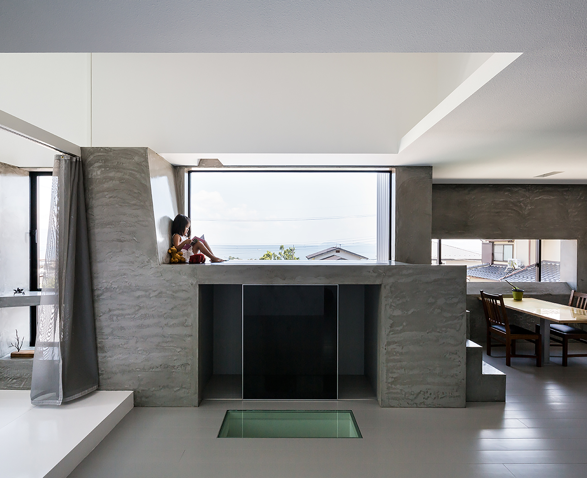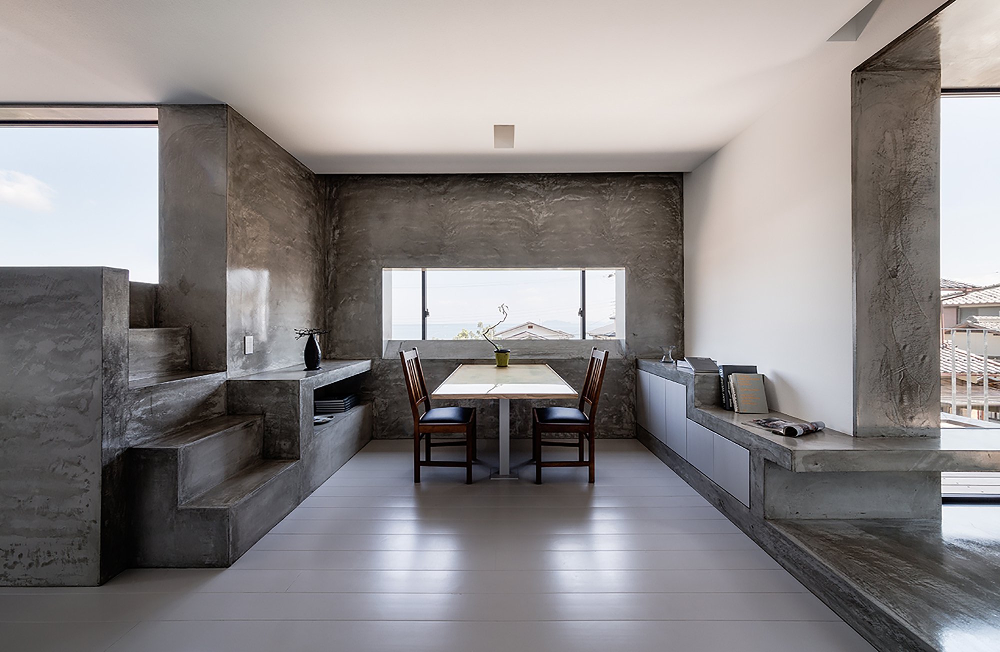 The windows as framings produce comfortable spaces where you can enjoy light and scenery without being annoyed by eyes of neighborhood. The spaces incorporate a table, bench, book shelf, niche, and other furniture items so that you can utilize there to view outside, read books, eat meals, etc., which brings out characteristics of each space and provides its versatility.