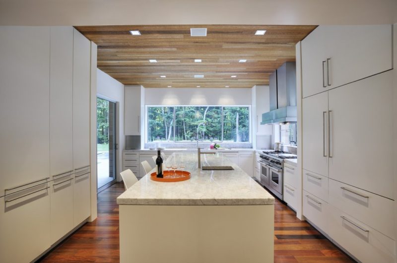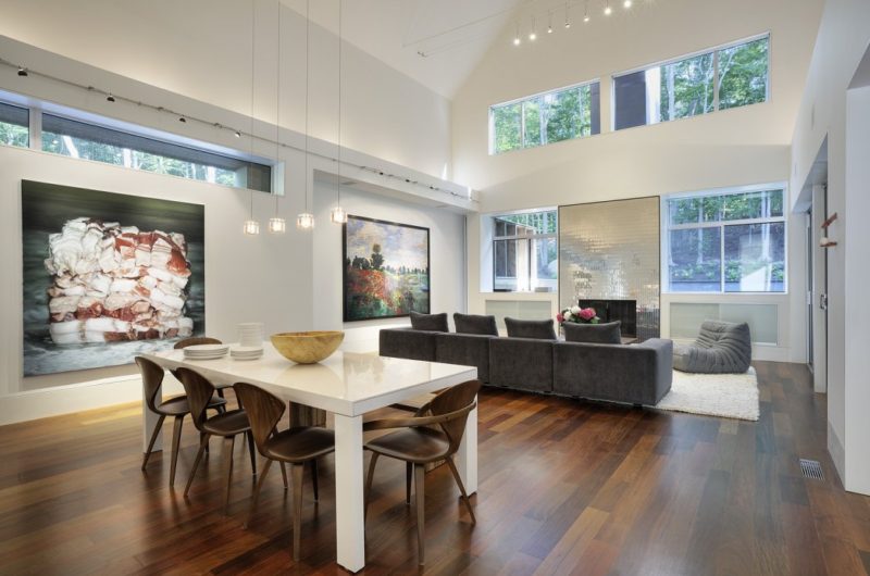 The architects created a house that, admired from the driveway, features a gabled form, shingled siding and a massive chimney, resembling the traditional houses on eastern Long Island. Upon a closer look, the shingles are a woven screen made of oak survey stakes, and the ‘massive’ chimney is made of thin concrete panels. The ‘deception’ continues in the interior of the house as well, where the translucent stone wall that encloses the stair is in fact a double paned glass filled with seashells. But the tricks end when it comes to the double-height living-dining area, which is the perfect place for the family’s collection of large works of art. All in all the house is a piece of art playing with visual effects and human perception.