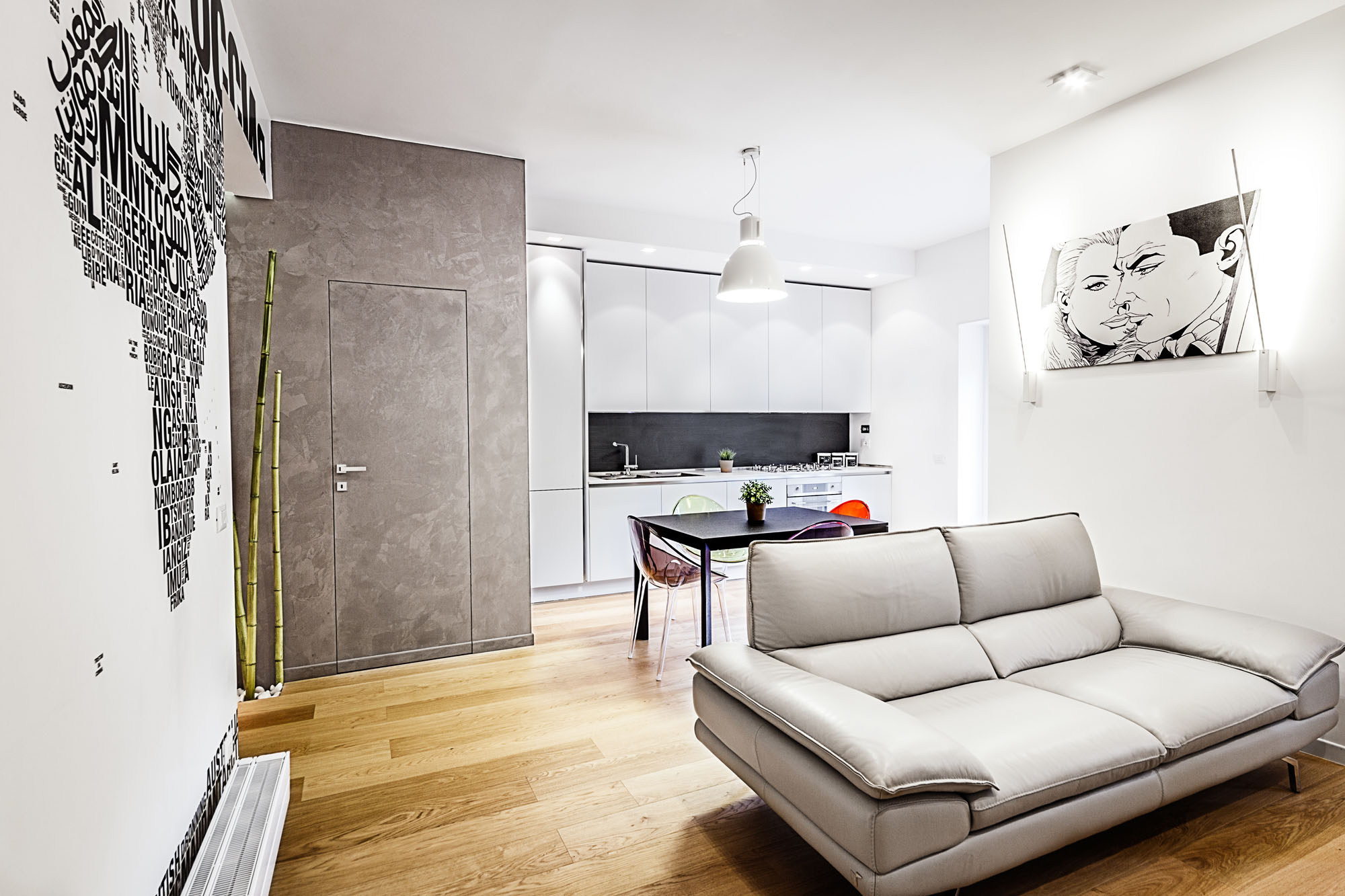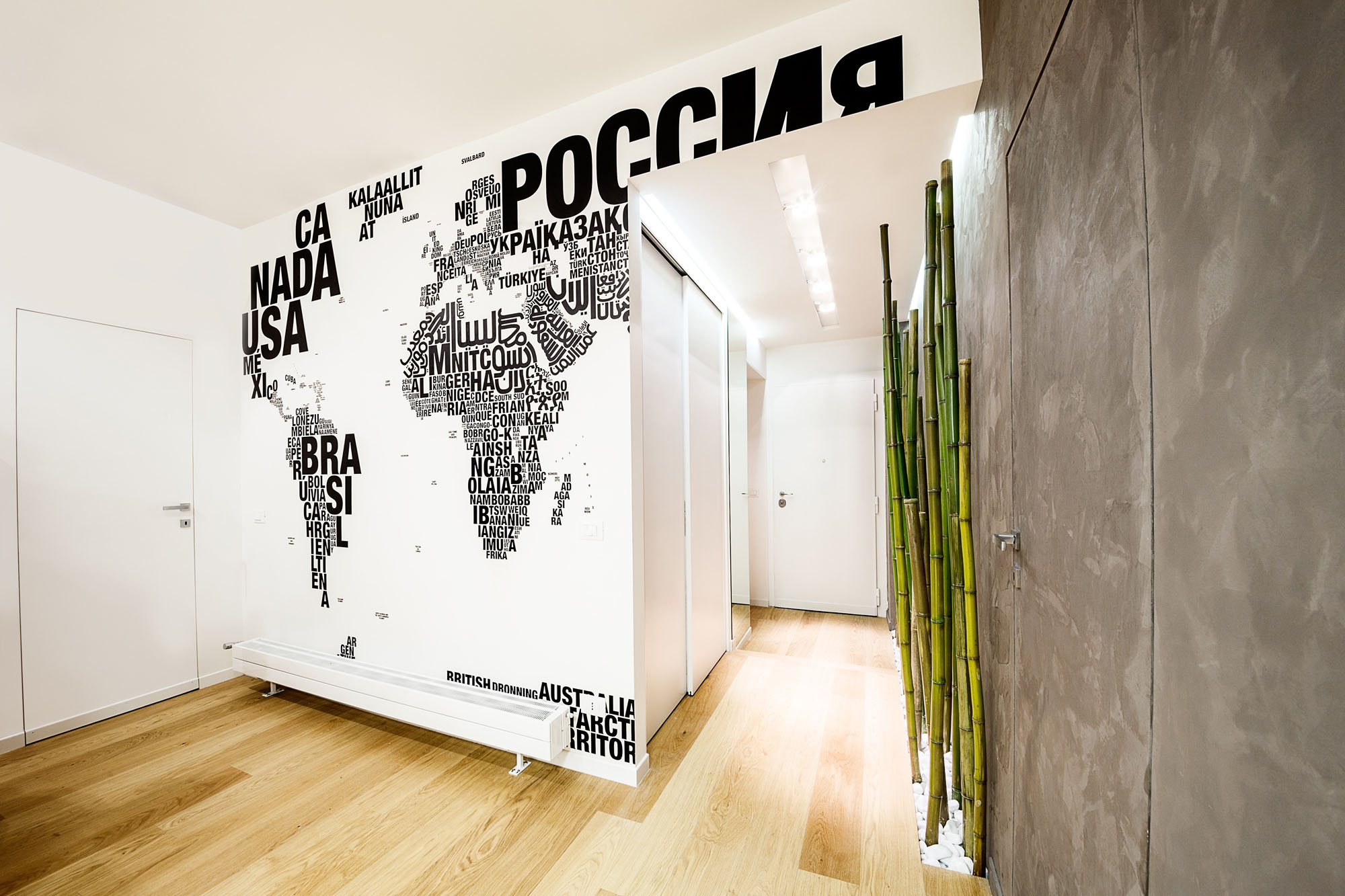 The feeling of being immersed in a bamboo forest is amplified by the optical effect created by the large mirror at full-height. The open floor plan is cozy, colorful and features a texture, black on white, that in drawing the world nominates countries in the different languages.