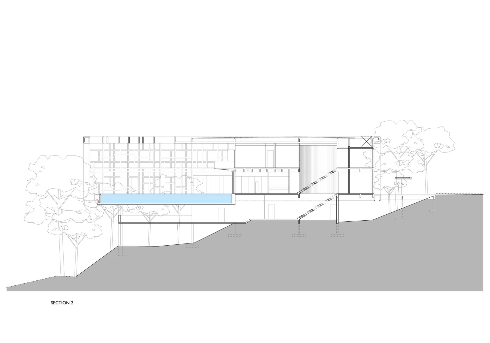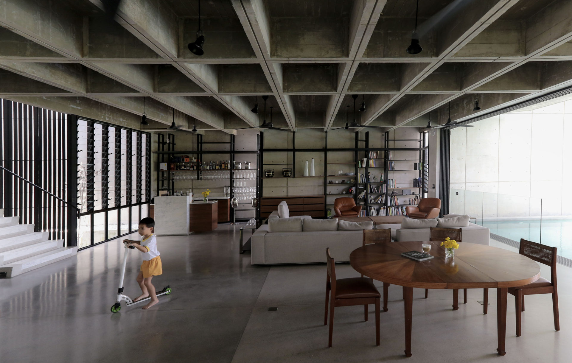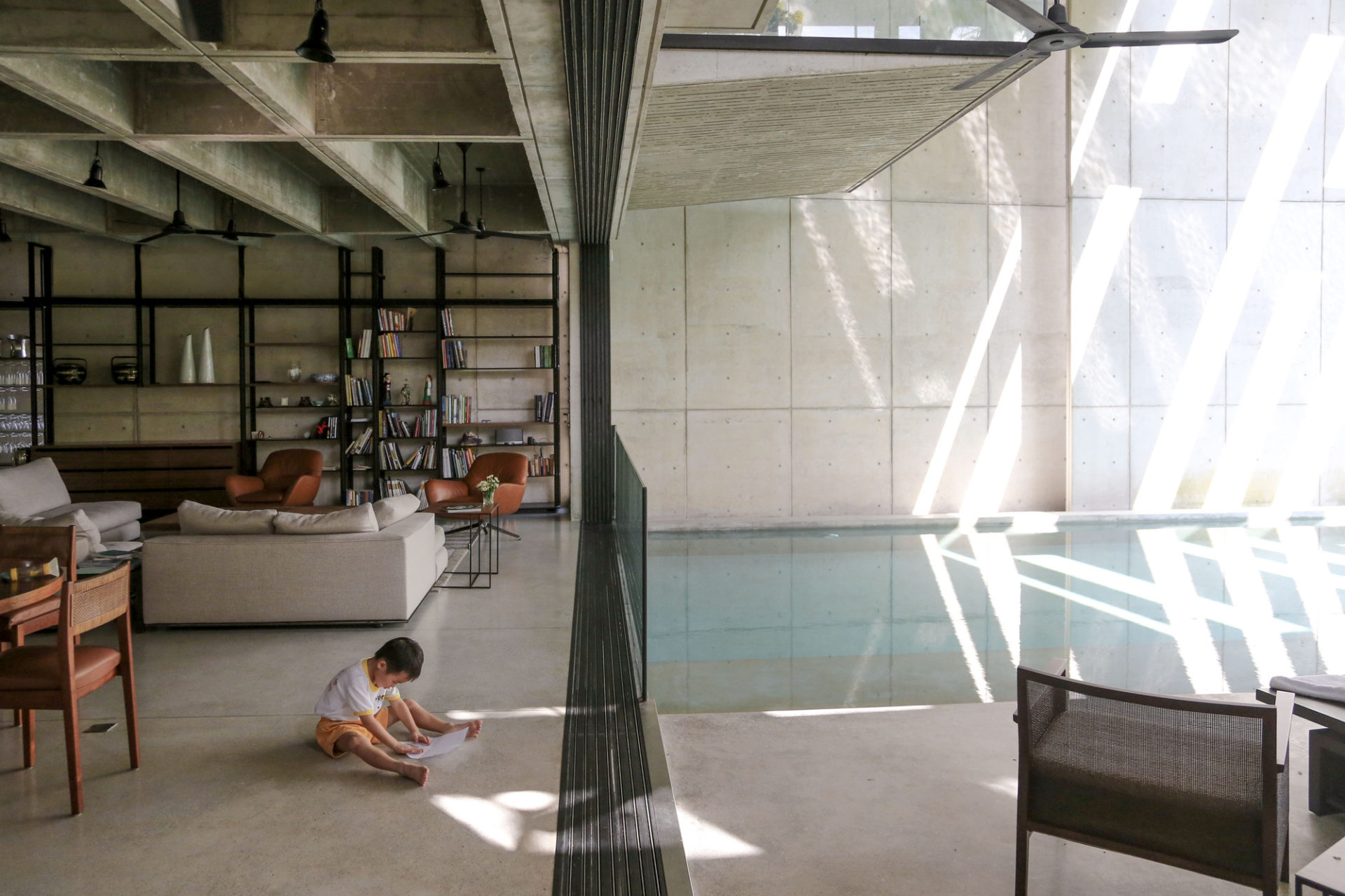 A concrete egg-crate structure surrounds the house and allows natural light to enter its spaces while limiting excess heat. The structure includes numerous perforations that allows some of the outdoor overgrowth to seep into the main volume thus blurring the limits between the indoors and outdoors. The egg-crate volume was created using in-situ concrete, which helps filter the rays of the sun. The primary living areas such as the dining area, the living room and the swimming pool are inserted at the entry level, while the bedrooms are located at the upper floor. On the lower ground, the architects implemented the service areas as well as a garage. The upper floor windows boast special designs that offer exceptional views of the nearby trees.