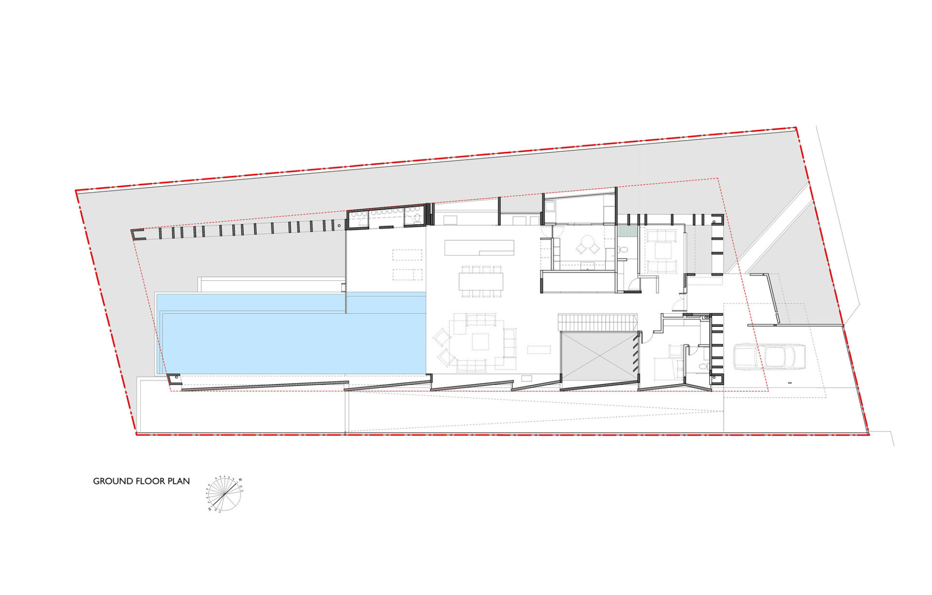 The main spaces- living, dining and the pool are positioned at the entry level; the bedrooms are placed on the upper floor; finally, a garage and service area sits on the lower ground. This ensured that dampness and pest is kept away, keeping the house airy and dry.