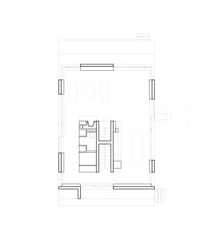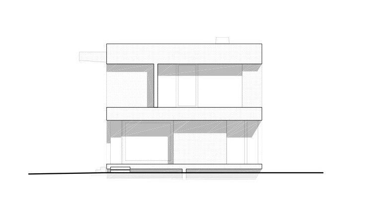 The first floor of the home emerges slightly from the cellar. Technical rooms and extra rooms are placed in the basement. The raised ground establishes a special relationship with the garden, expressing a sort of monumentalism in this small building.