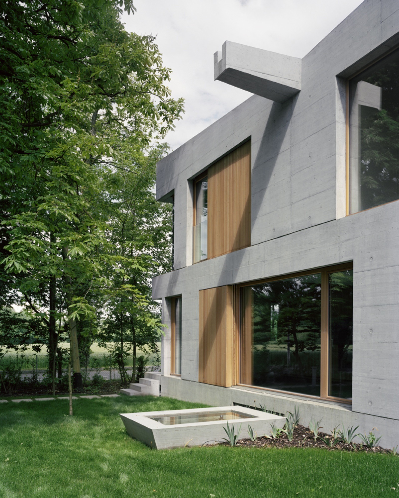 The house is composed of three concrete volumes stacked together in various ways. The basement comprises the service areas as well as a few extra rooms, while the second floor includes a trio of bedrooms. The upper floor flaunts an inverted roof that is used to channel rainwater into a small collection pond. Inside, high quality wooden elements are used for the wall paneling and floors, while generously sized windows allow natural light to flow throughout without much obstruction.