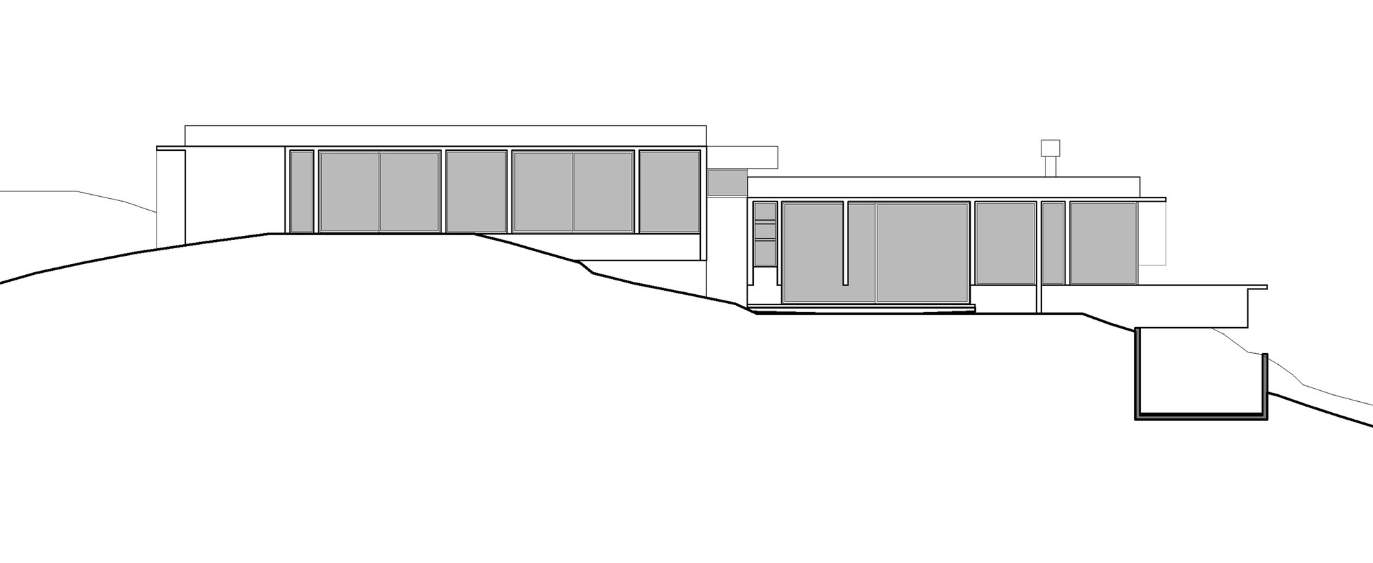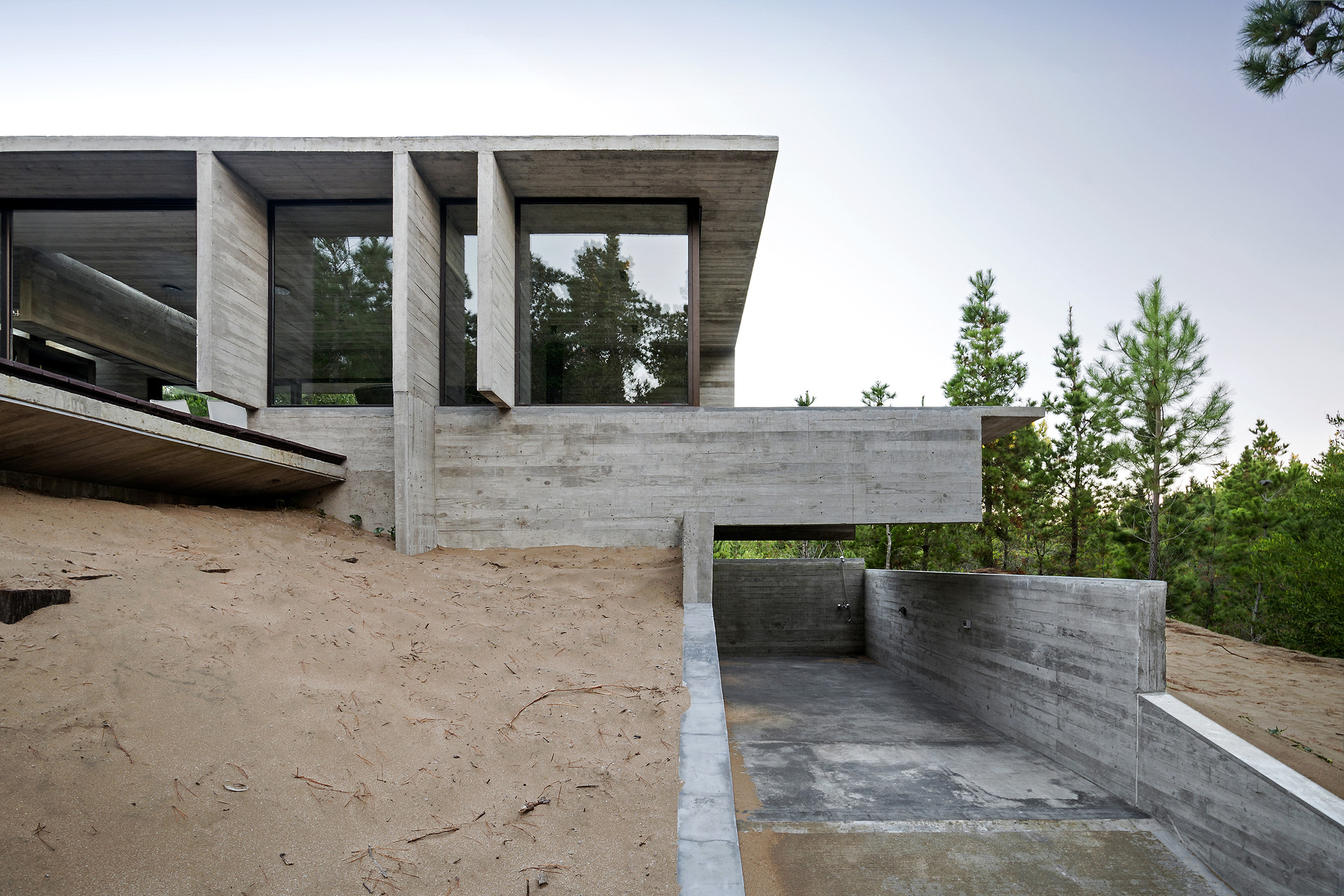 The volumes are solved with slabs of H º A º, supported in bearing walls through simple beams on the south façade, and through closed inverted beams on the north side to capture more light. The partitions are grounded in the dune by perimeter beams. The volume which covers the garage was designed as a cantilever which rests on two major beams, to make evident the independence of the structural system that solves the dune rise and the house itself.