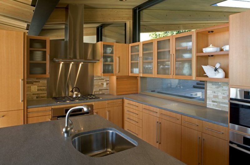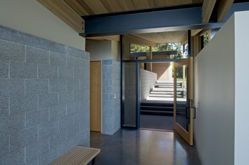 The ceilings are made out of cedar which extends to the exterior and turn into the soffit material. The structure consists of two walls inside: the ground face CMU block wall which divides the principal hall from the Guest Suite, and another one that encloses the Master Suite.