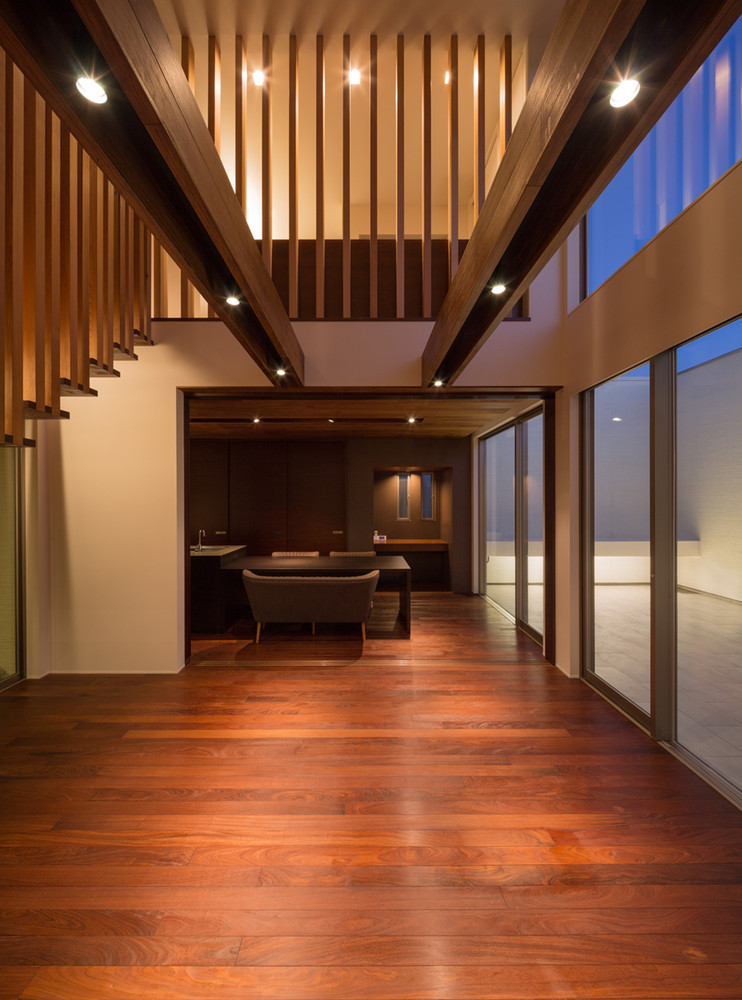 In addition, I designed another smaller light court opposite to it and all rooms inside the house have a good quality of brightness and ventilation. I used a window that can protect privacy from outside on smaller light court so they can feel the seasons, changes of daytime, rain, wind etc. by themselves.