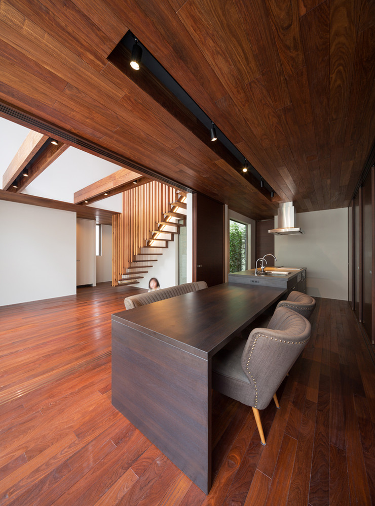 Furthermore, the home was built back from the road in order to allow space for planting trees. The overslide door that permits access onto the property can only be opened using a remote control, and it further improves privacy and safety. The parents and children can enjoy quality time together on a court terrace, which is connected to the dining room and the living room at the south of the lot. There’s also a smaller light court on the opposite side of the large one.