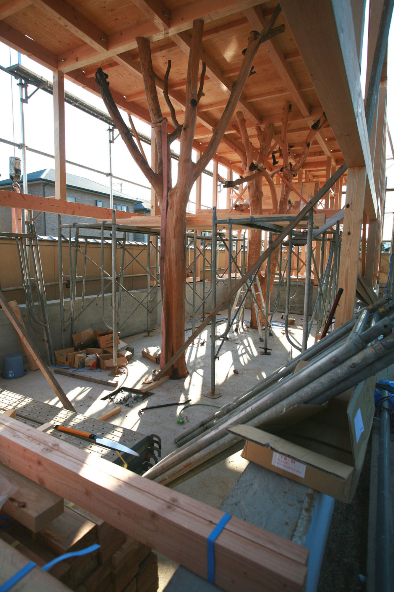 After they were smoked and dried from the water content, the trees were beautifully placed where they used to stand and turned into main structural columns in the center of the living room, dining room and kitchen.