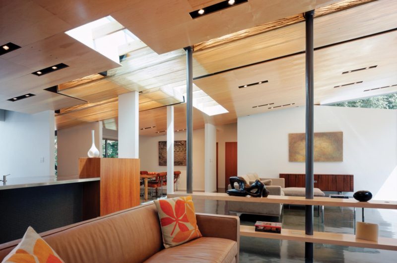 The main addition to this stunning home involved an extended roof as well as a glazed rear façade. However, the ceiling is undoubtedly the main focal point of the renovation, and so it was outfitted with a series of track lighting elements that were placed neatly behind a special system made out of plywood panels. This system is directly linked with a stunning skylight that allows for a seamless flow of natural light within this superb home, thus helping blur the boundaries between the indoor and outdoor spaces.