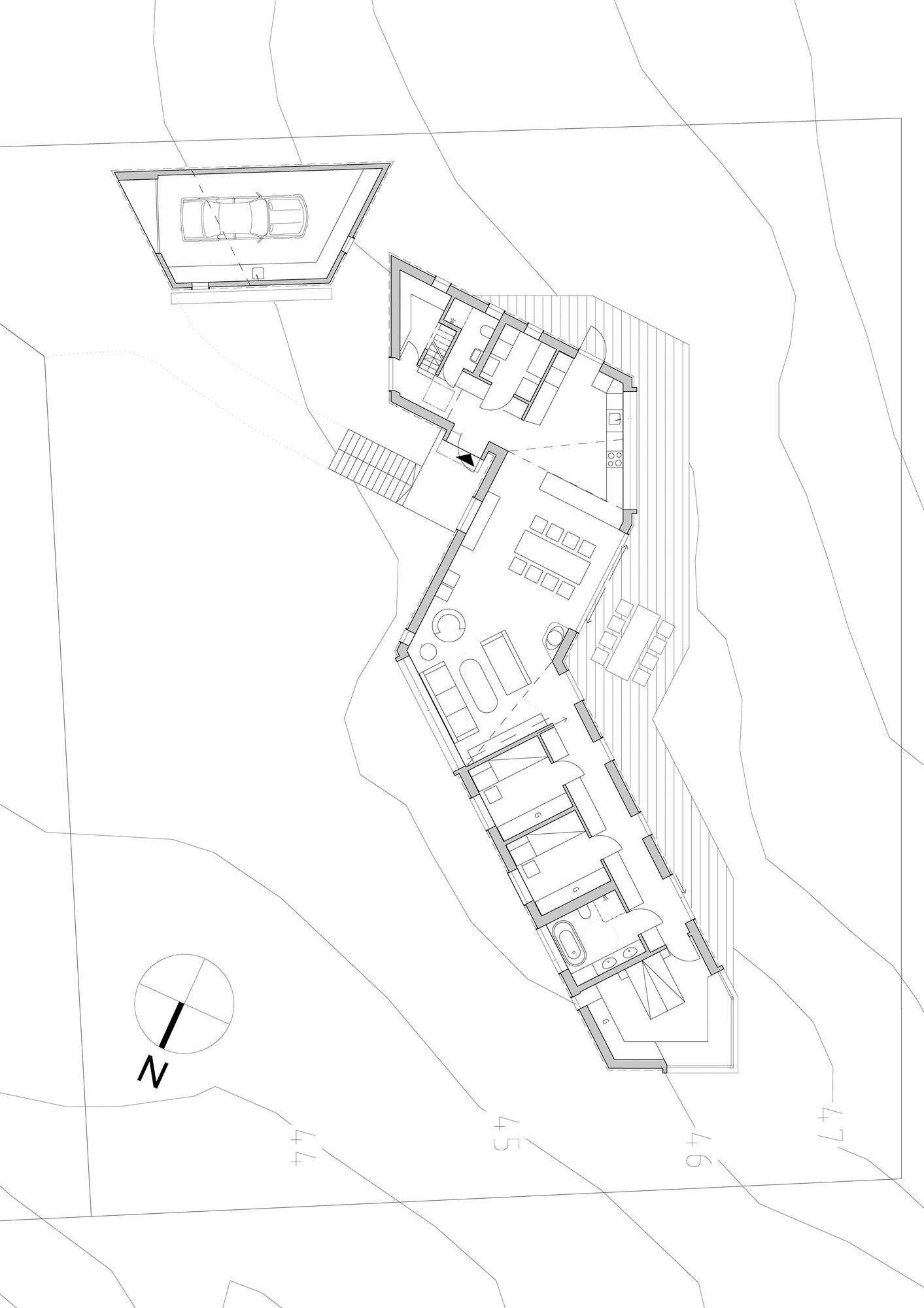 Because the customer was very picky, the designer needed to meet him during several meetings in order to test various volumes and to visit a couple of sites. The result came out pretty nice: the house is narrow, extended and situated at the very