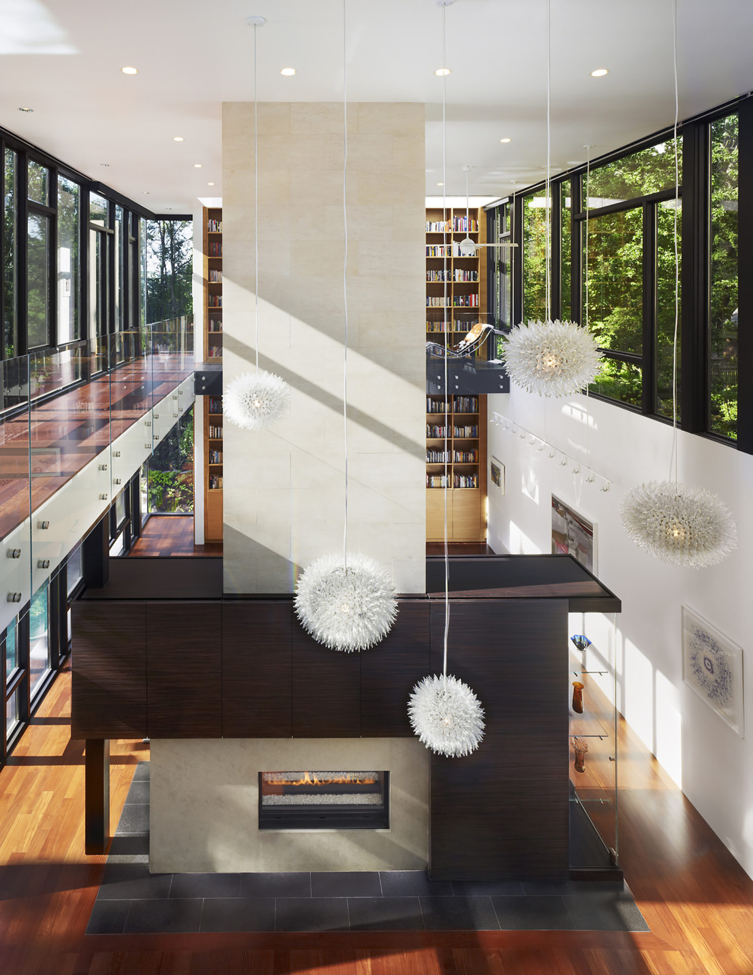 Despite the relatively large size of this house and the extensive use of glass, the house remains incredibly energy efficient. While the large amount of windows and skylights provide generous day-lighting, computer programmed shading devices modulate solar gain. A geothermal HVAC system, including hydronic heating, combines with solar hot water tubes and photovoltaic panels with the goal of providing a net zero energy house.