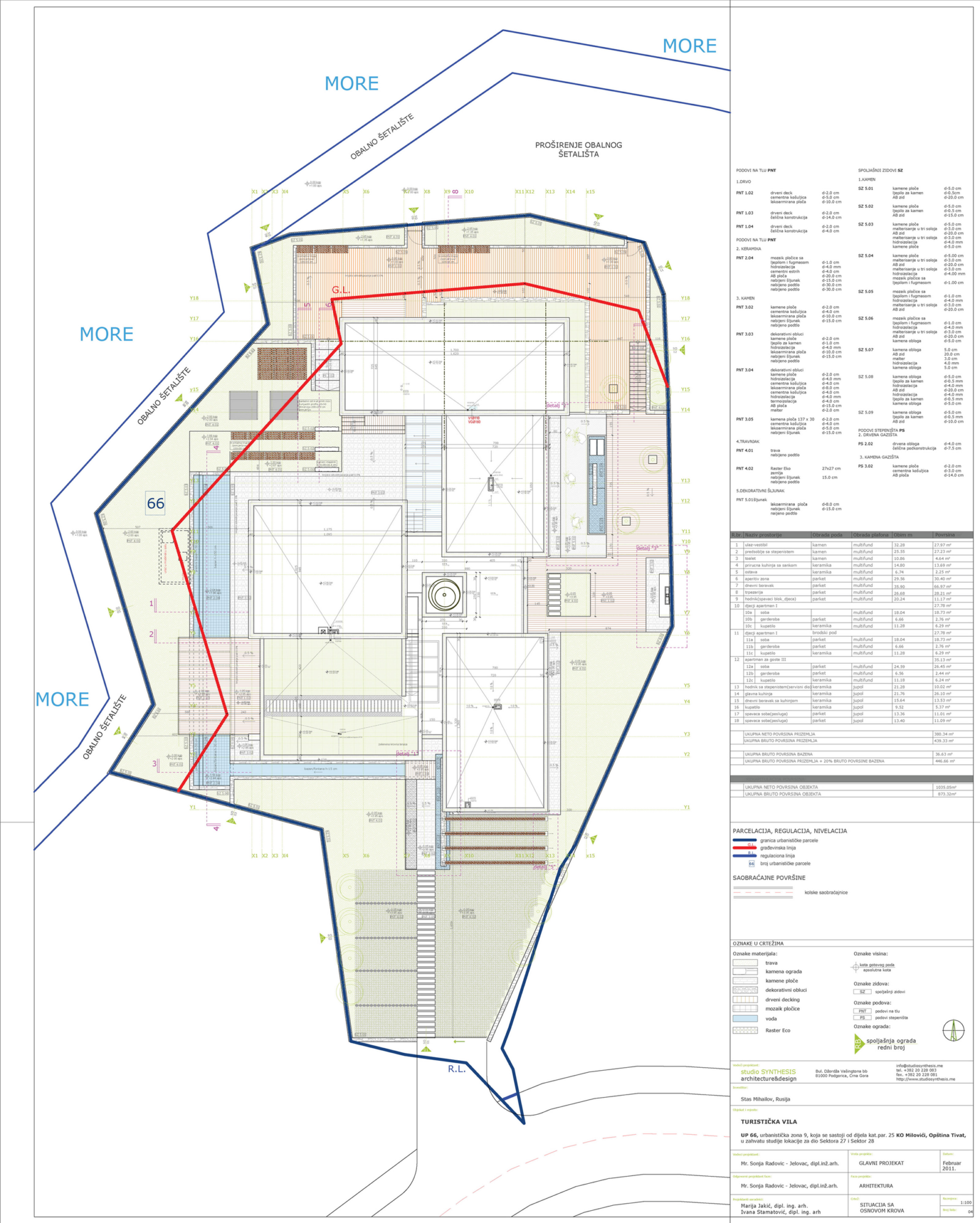 In addition to relatively densely developed and planned structures in the surrounding, the building is at solid distance from surrounding lots at 3-5m spacing. At the boundaries with the coastal walkways, there is also 5 m spacing. The ground floor is fully adjusted to the terrain configuration, and planned land use allows for maximal exploitation of surfaces and good connection with all contents at the ground floor. Building is facing north-south along the length of building. Master day and night-time zone are facing east, apartments at the semi-basement level are northward orientation, and children zone is facing west.