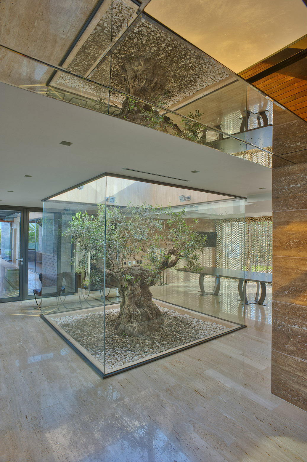 Daily zone and bedrooms are facing the sea. Big glazed openings completely open the building towards the sea and provide 180 degree view. In the middle of the building is atrium – specific semi-closed space, with glazed walls. This space accommodates olive-tree with insolation on acceptable level.