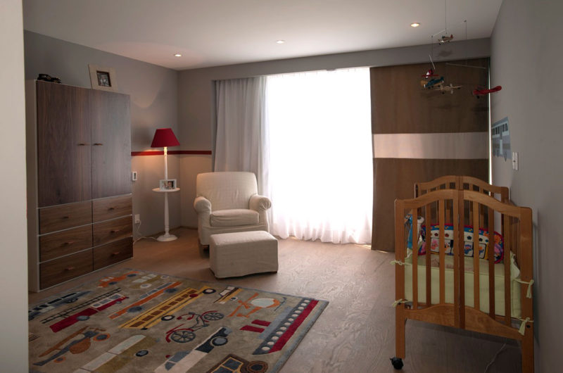 The focus point of this residence is the double-height living-dining area, which amazes with its large windows, outstanding furnishings, and the perfect combination between the wall colors, the drape materials and the shades of wood. The beautiful chimney, which divides this space, gives a relaxing and calm feel to the entire room.