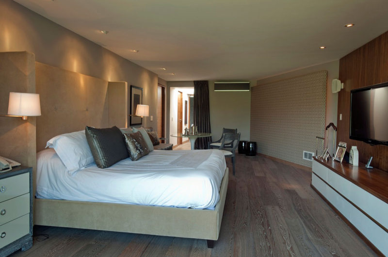 The spacious interior has double-height spaces and large windows that allow natural light to flow into the house, and offer magnificent views of the surroundings. The staircase leads to a wooden bridge that separates the main bedroom from the rest of the bedrooms and the family room.