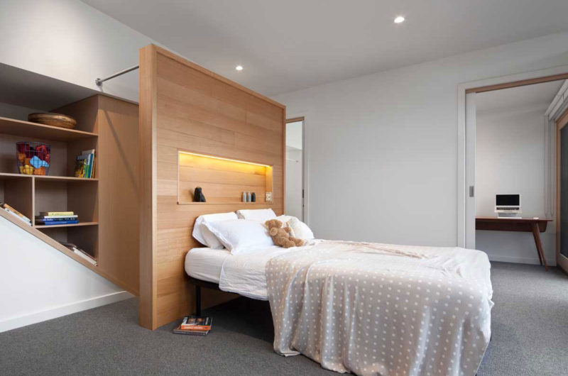 The rake of the living room ceiling opens the space up to the garden and full height double glazed windows connected the room to the deck, allowing natural light to penetrate deep into building. A staircase wrapping around the fireplace leads to the master bedroom, ensuite, walk in robe and study on the first floor. The bedroom and study, which look down over the garden and catch glimpses of the city, provide a quite retreat for the couple from their busy lives. Above the kitchen and laundry structural provision has been made for a future roof deck, which is accessed via the master bedroom.