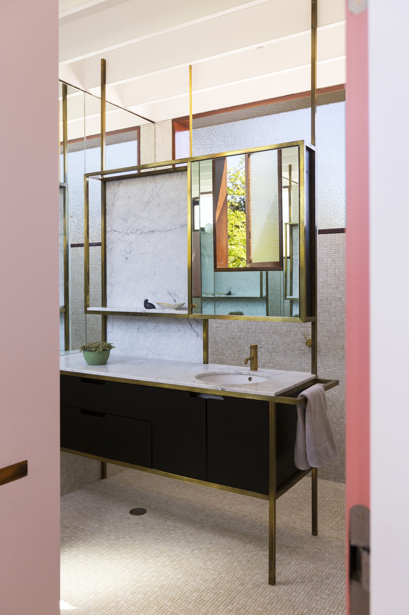 The material palette similarly references the original and surrounding built language. Sandstone, bagged recycled brick and rough rendered masonry are contrasted with off form concrete and an assemblage of new and recycled patterned and clear glass. Internally, painted vertical timber boards line the front section of the house and are echoed in deep concrete reveals to the central living room formed from salvaged fence palings from the site. In the rear of the house painted timber floor and ceiling joists are left exposed creating a sense of informality in contrast to the smooth planes of the front. Joinery units are simply painted or stained and for the most part assembled from scrap left over or recycled material on site. Colour and texture are used as a playful device throughout the home. Layered unexpected colour pairings articulate and expand the rooms beyond the confines of their walls. Brass framed joinery items are designed as pieces of furniture – hovering on fine legs or suspended from the ceiling they allow the dimension of the room to continue over and around.