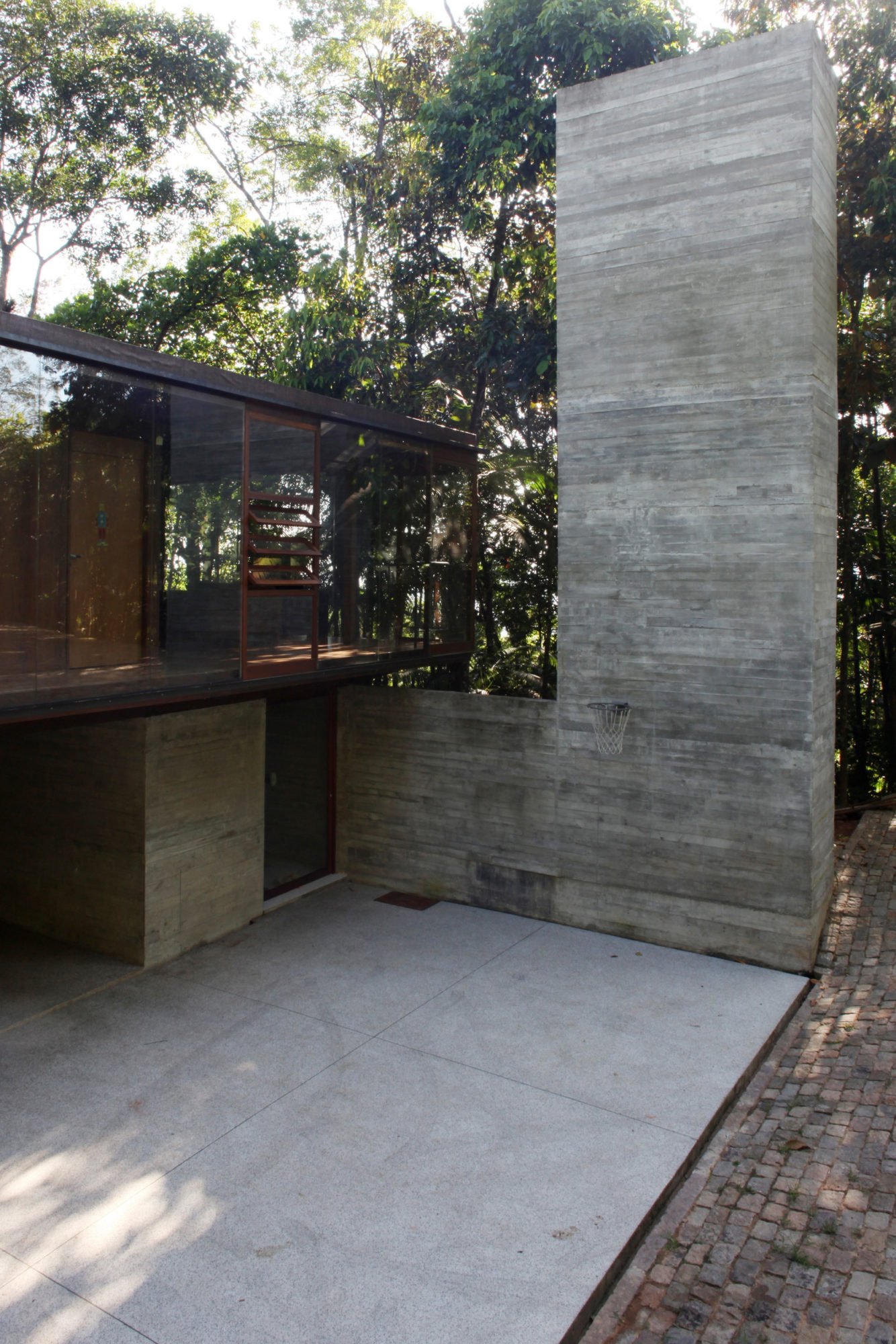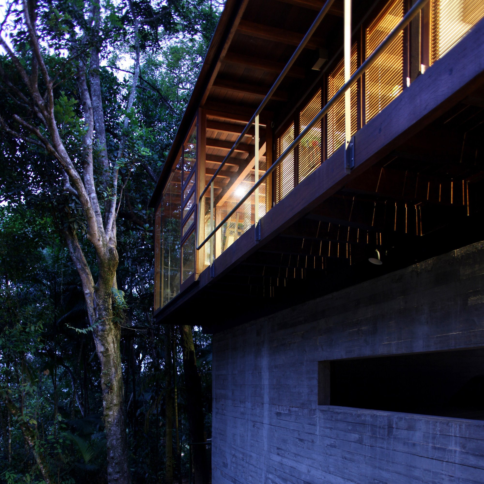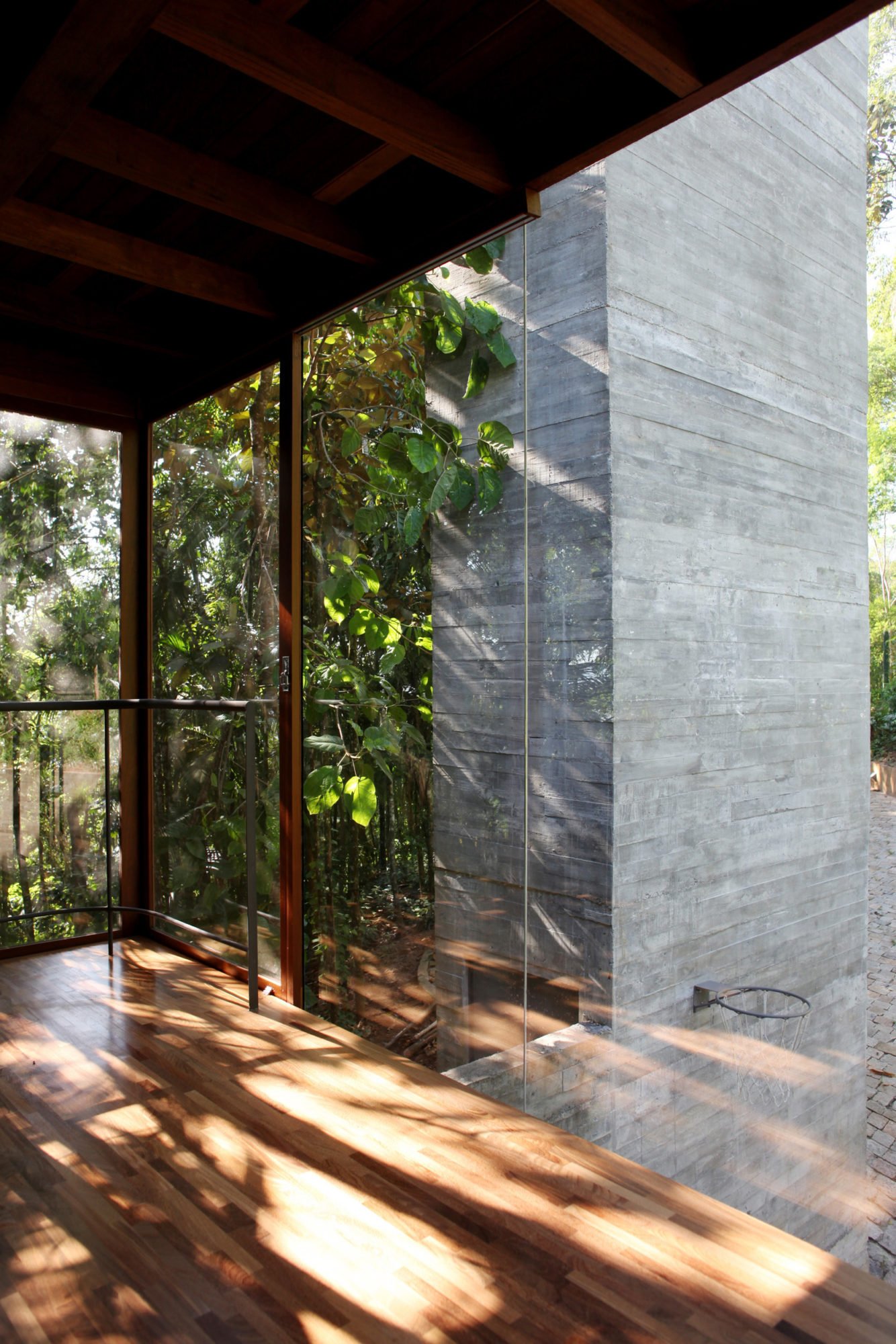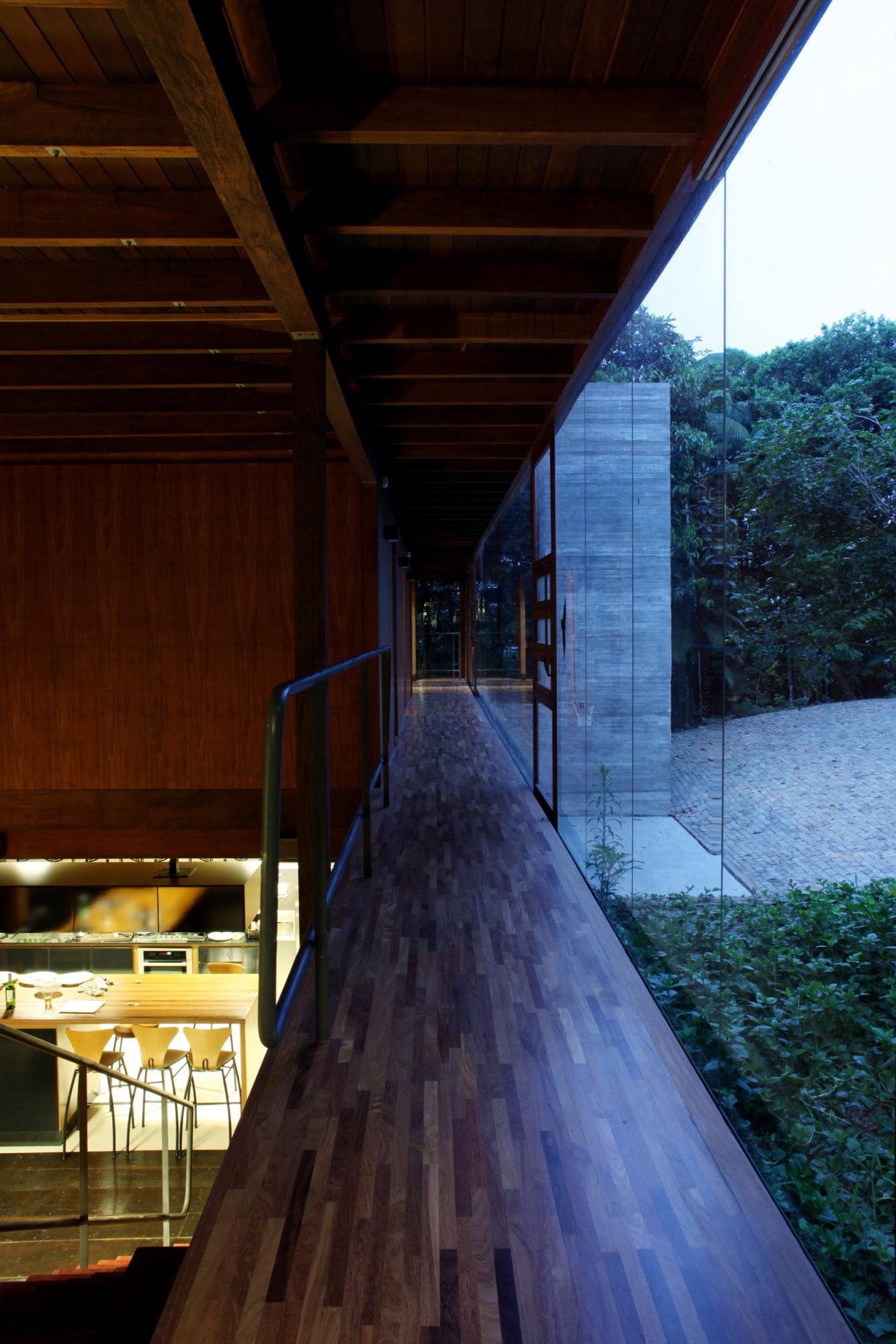 The lower floor of the Joinville House incorporates the main living spaces, the service areas and a swimming pool. The bathrooms, pantry, ovens and fireplaces are housed within a single longitudinal volume that also includes the indoor and outdoor staircases. The upper floor is made out of timber and rests upon the sturdier lower concrete floor. The edges of the upper level incorporate a studio and a small living room, while the core is reserved for the bedrooms.At the same level, a glass wall extends from the floor to the ceiling and offers great views of the nearby forest.