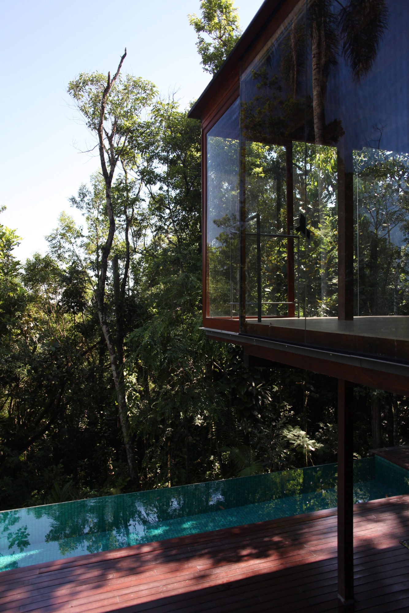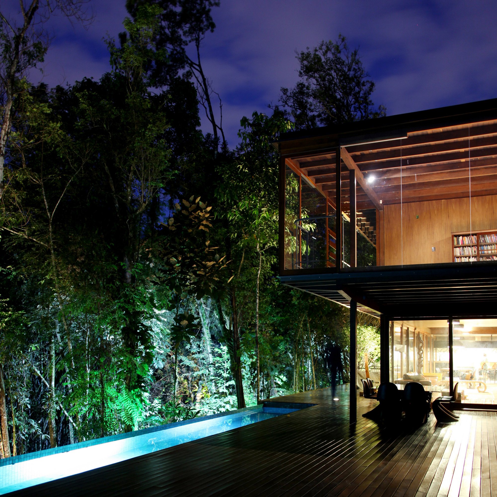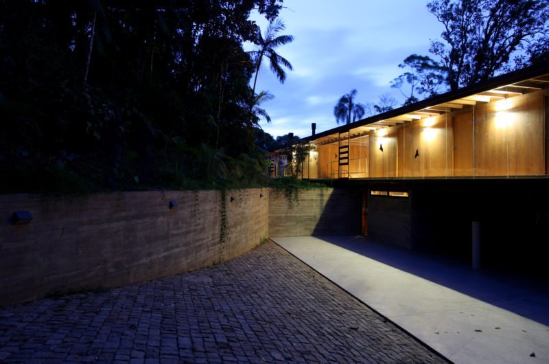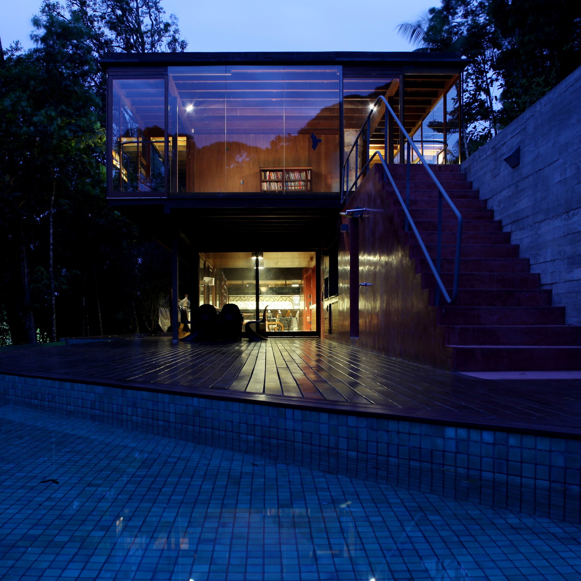 The lower floor of the Joinville House incorporates the main living spaces, the service areas and a swimming pool. The bathrooms, pantry, ovens and fireplaces are housed within a single longitudinal volume that also includes the indoor and outdoor staircases. The upper floor is made out of timber and rests upon the sturdier lower concrete floor. The edges of the upper level incorporate a studio and a small living room, while the core is reserved for the bedrooms.At the same level, a glass wall extends from the floor to the ceiling and offers great views of the nearby forest.
