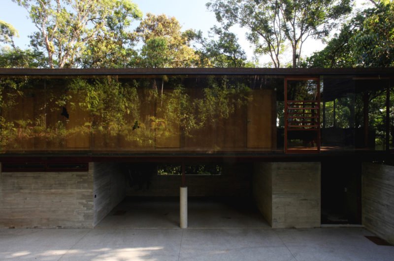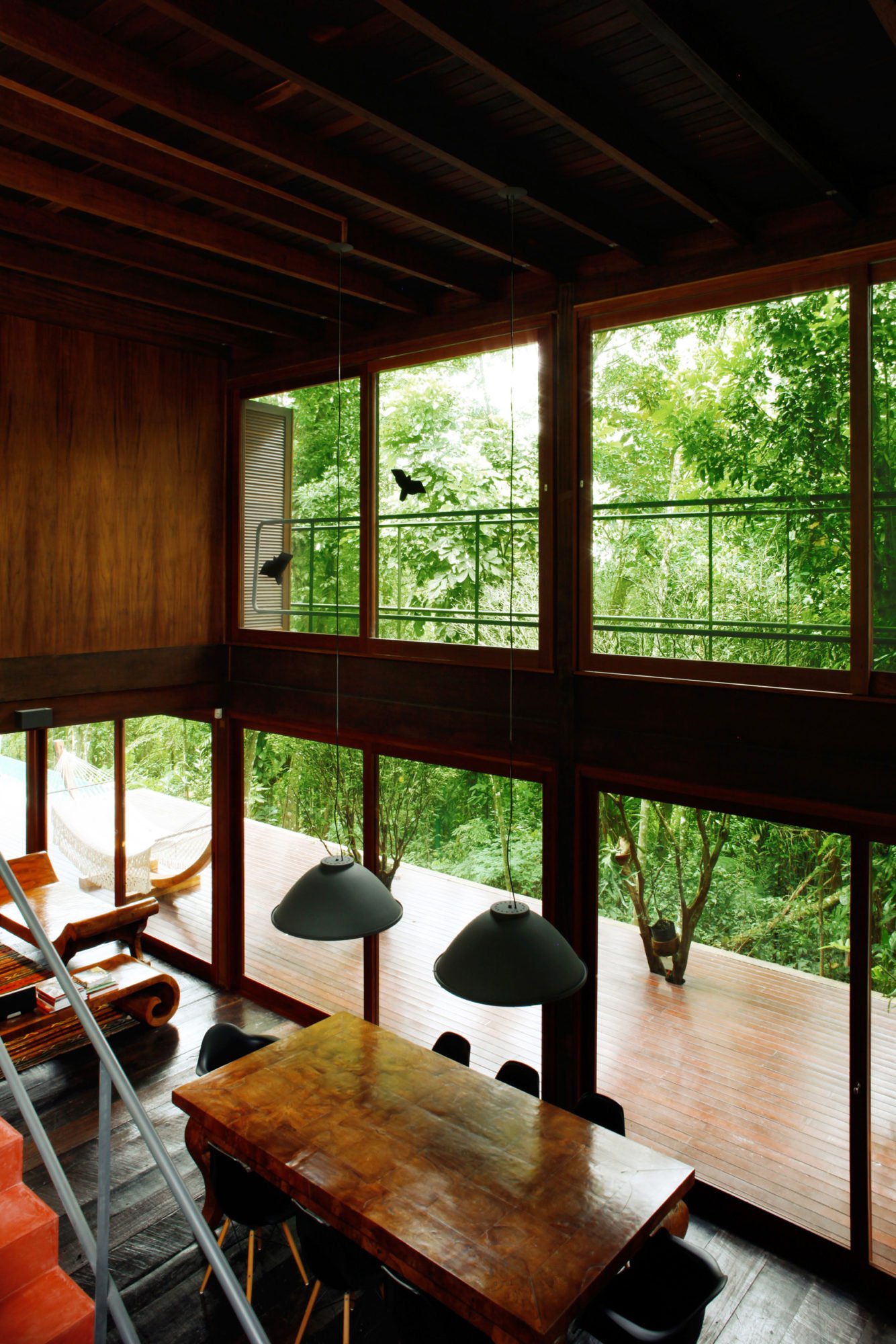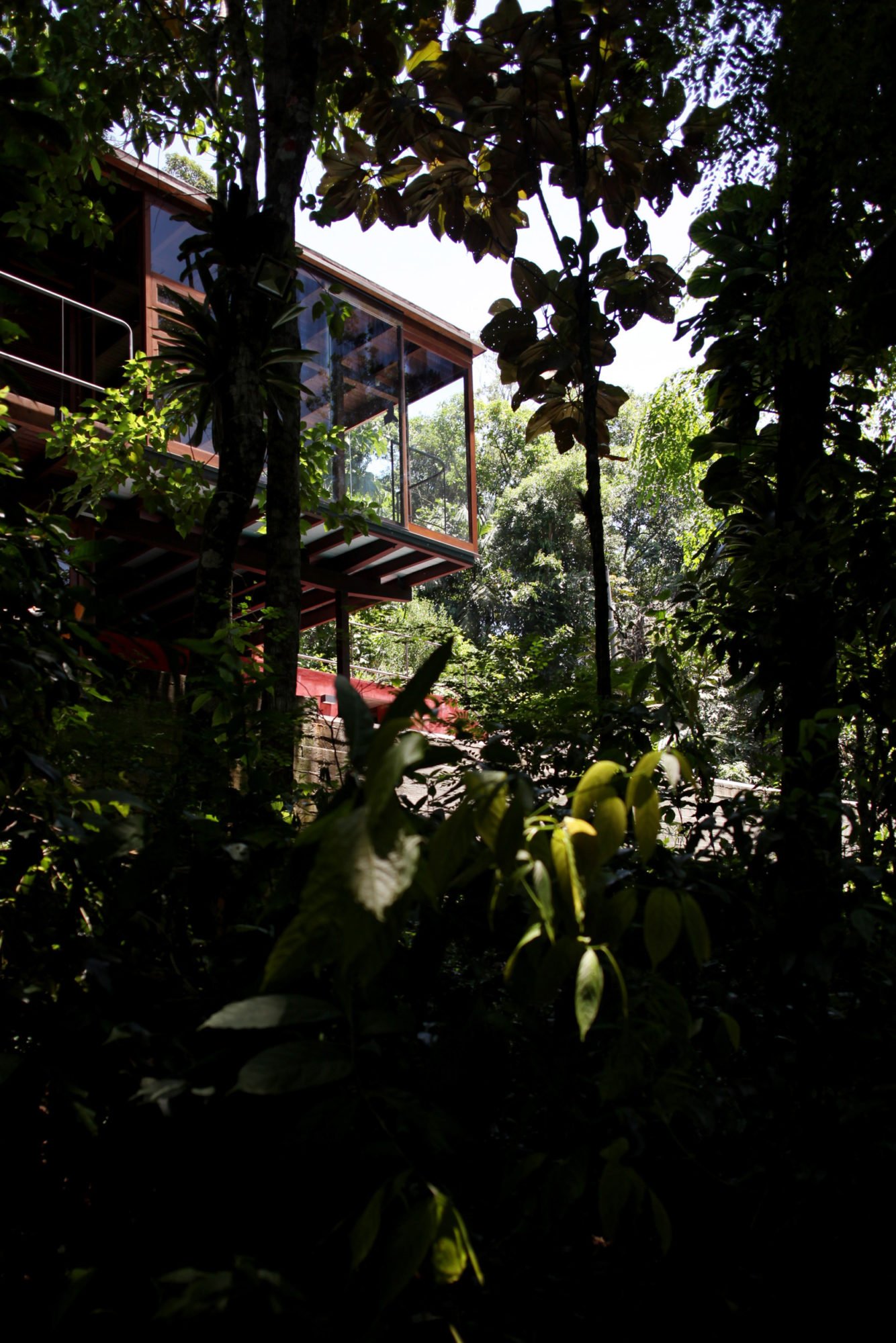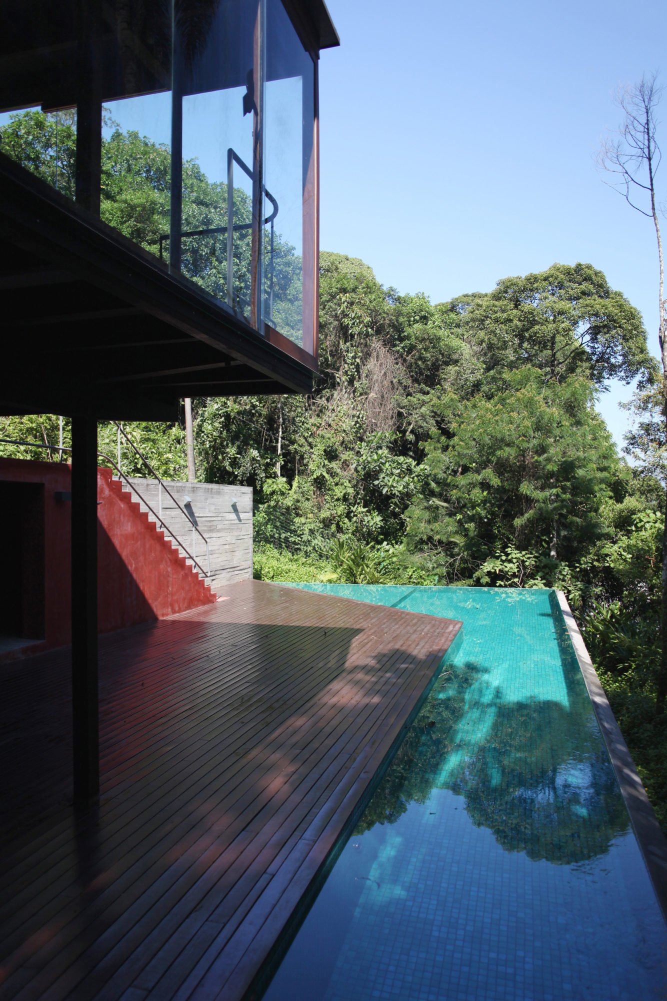 The lower floor of the Joinville House incorporates the main living spaces, the service areas and a swimming pool. The bathrooms, pantry, ovens and fireplaces are housed within a single longitudinal volume that also includes the indoor and outdoor staircases. The upper floor is made out of timber and rests upon the sturdier lower concrete floor. The edges of the upper level incorporate a studio and a small living room, while the core is reserved for the bedrooms.At the same level, a glass wall extends from the floor to the ceiling and offers great views of the nearby forest.