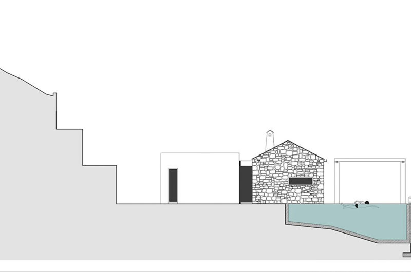 Finally, white render reflects the sun, the stone cladding offers its thermal mass connecting the building with the surroundings and together protect the inhabitants from the weather conditions. A configuration revealing the endless view to the horizon and was born out of consideration for the steep relief and the local traditional materials.