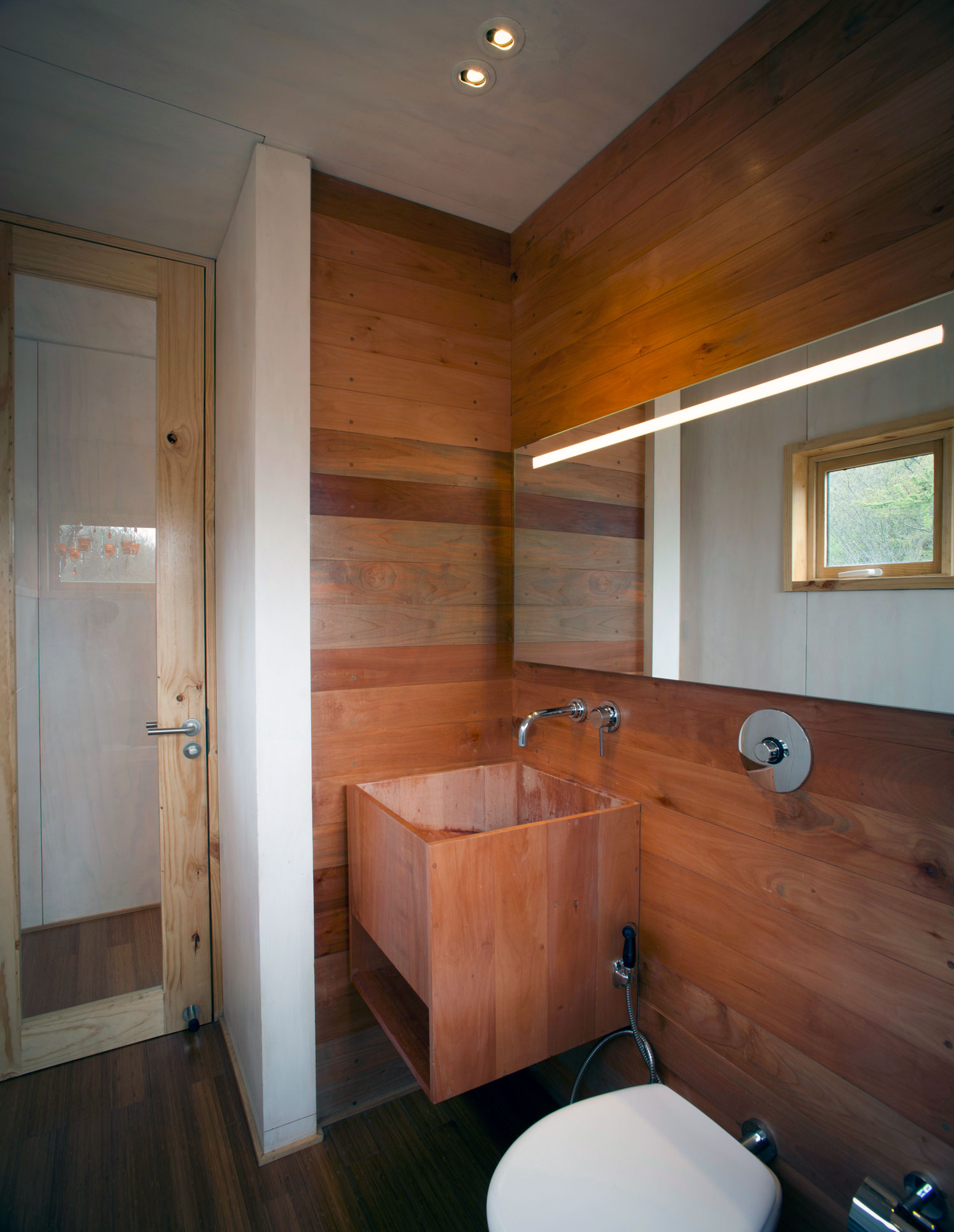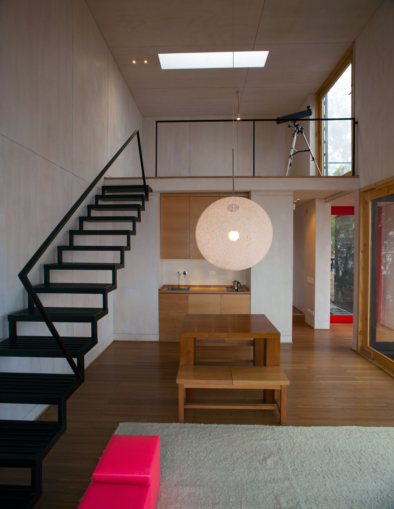 The main material, used in building it, was the steel because of its faster construction and versatility, but for the coverings the wood fit perfectly. The idea of the concept was to create a low budget solution in response to the environmental conditions that could gather all the facilities needed such as thermic comfort or incorporation of natural light and solar energy.