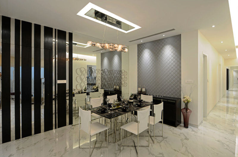 White walls, white upholstery and rich sheer curtains in white and grey lend openness to the space and make it look vast. Luxurious Satuario tiles have been used throughout the apartment, which help to give the perfect backdrop to the design elements. The extensive use of reflective surfaces on a white base have created a visually appealing and luxurious atmosphere. When combined with other elements like customised soft furnishings, exclusive wallpaper and stylish accessories, the space created is elegant and irresistible.