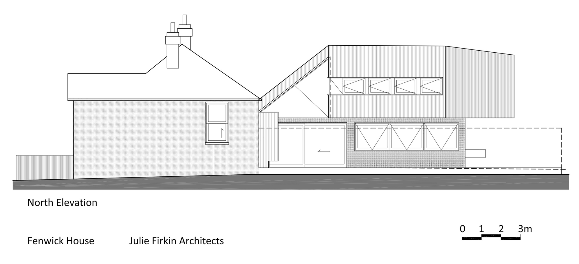 The addition is angular and tapered in form with an overhanging upper level which allows for the living spaces to be drenched in light in winter while providing shade in summer.
