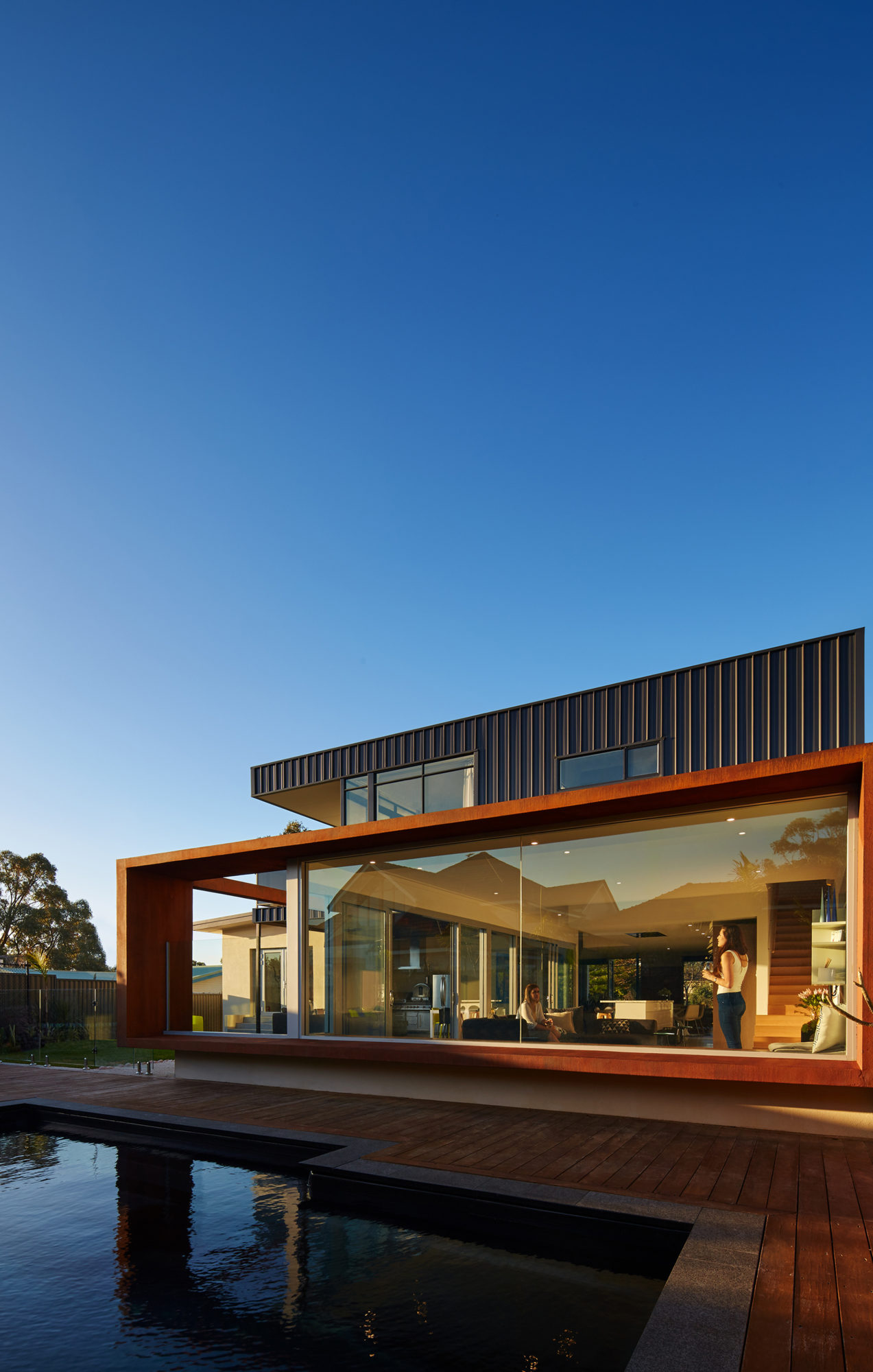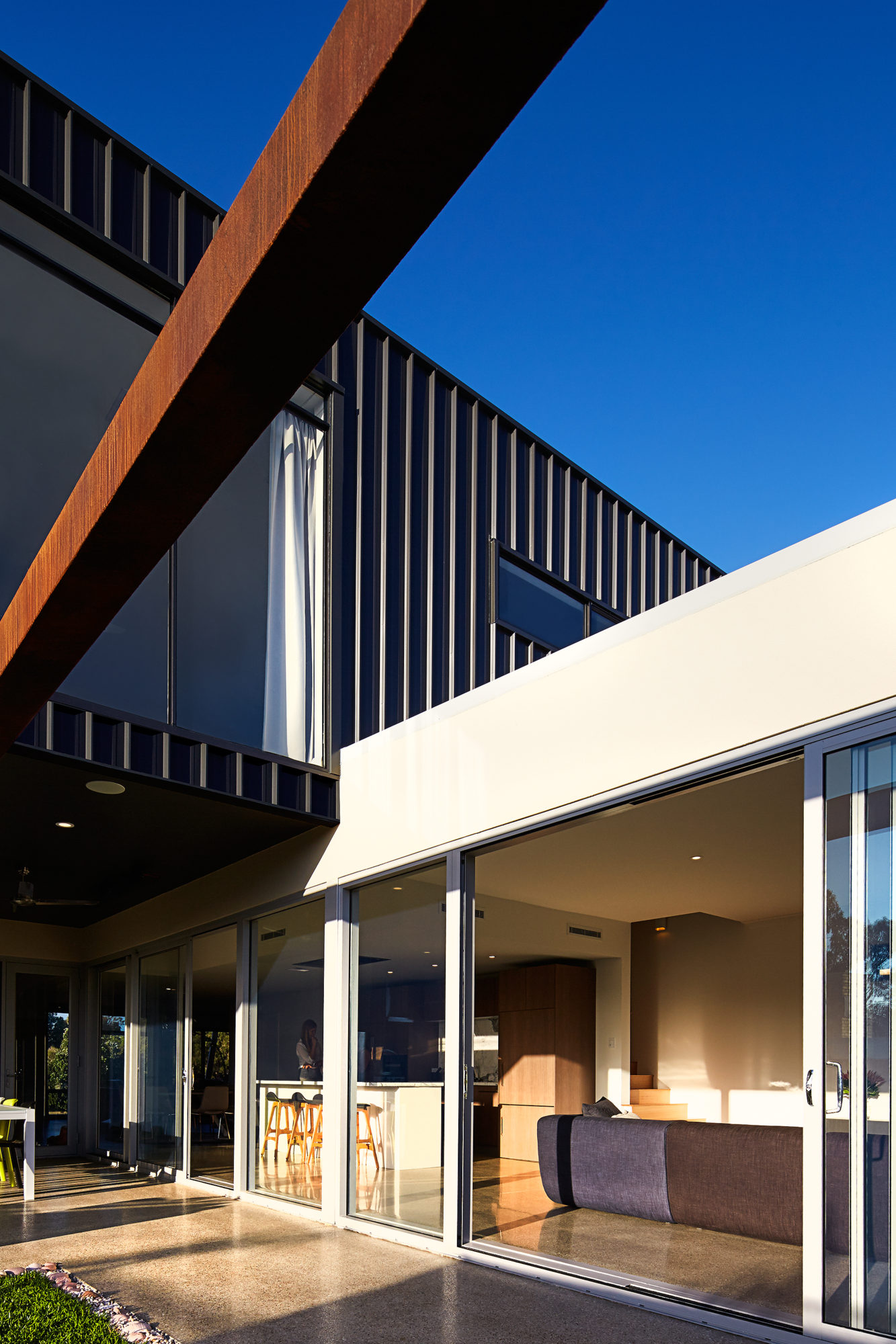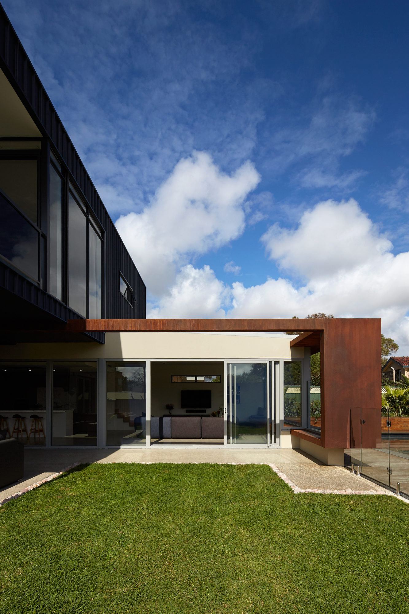 The exposure of the site warranted materials that were robust and would require only limited ongoing maintenance over time. As such the upper storey addition was clad in metal Colorbond metal sheeting, whilst the architectural picture-frame was realized in an oxidized metal paint over Fibre-cement sheet. All new structural elements were fabricated in steel as this provided the optimum flexibility to work with existing construction and allow straightforward assembly where there was limited site access and no cranage.