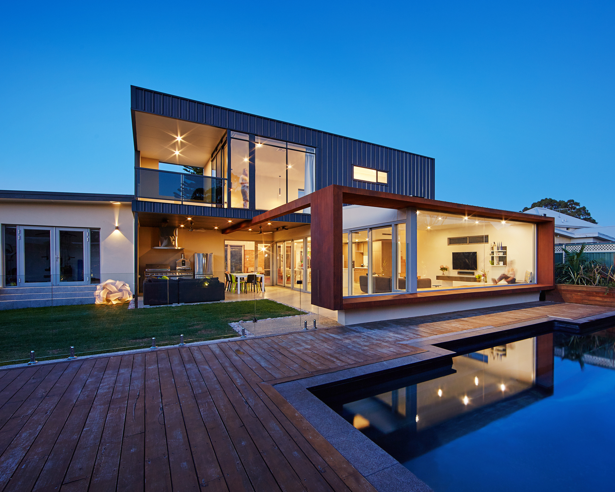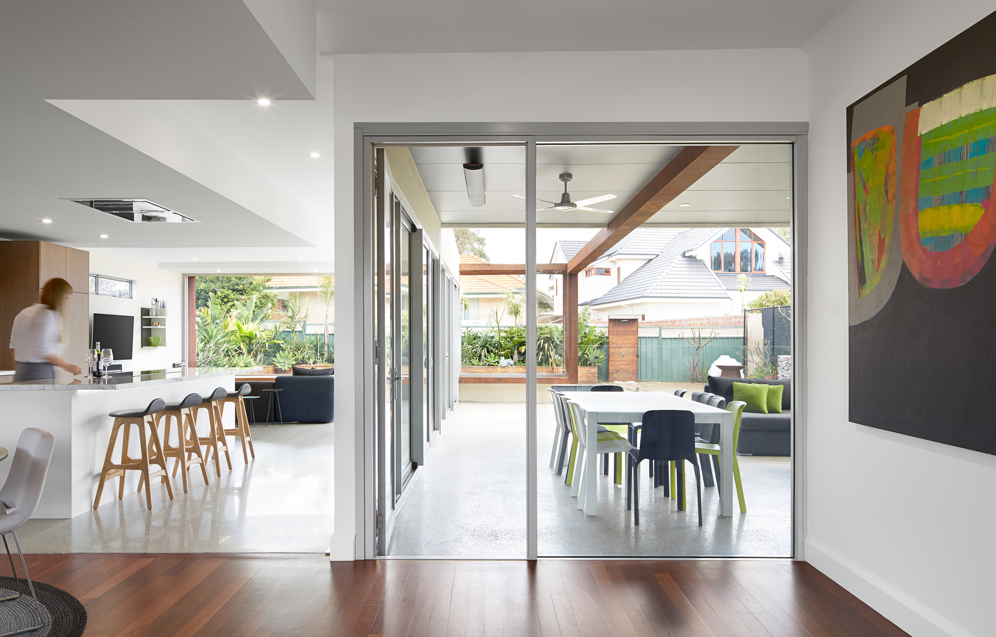 The existing front door to the original house was relocated to create a clear, legible link connecting the front and back of the building. The picture frame extends across this alfresco to enclose the opening, as an extended piece of structure that terminates in the key view to the pool. The kitchen became a linear space separating the old house with the living/ dining areas and opening out into the alfresco entertainment and barbeque area.