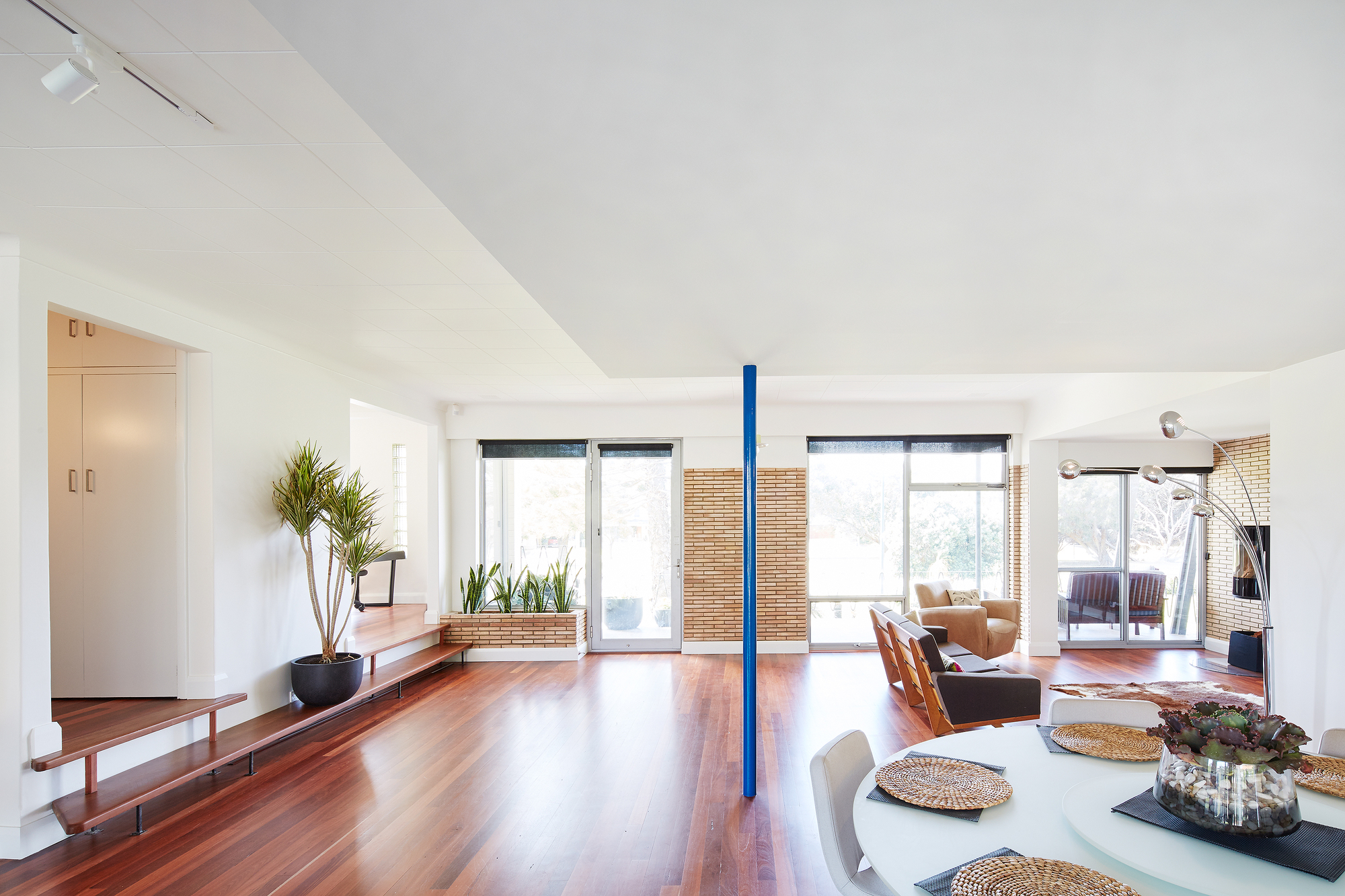 The exterior and interior of the house was carefully refurbished to reinstate the modernist dwelling, respectfully retaining the integrity of the old house. The transition between existing and new surfaces was controlled – polished concrete of the addition meets with Jarrah floorboards abutting along a simple steel edge.