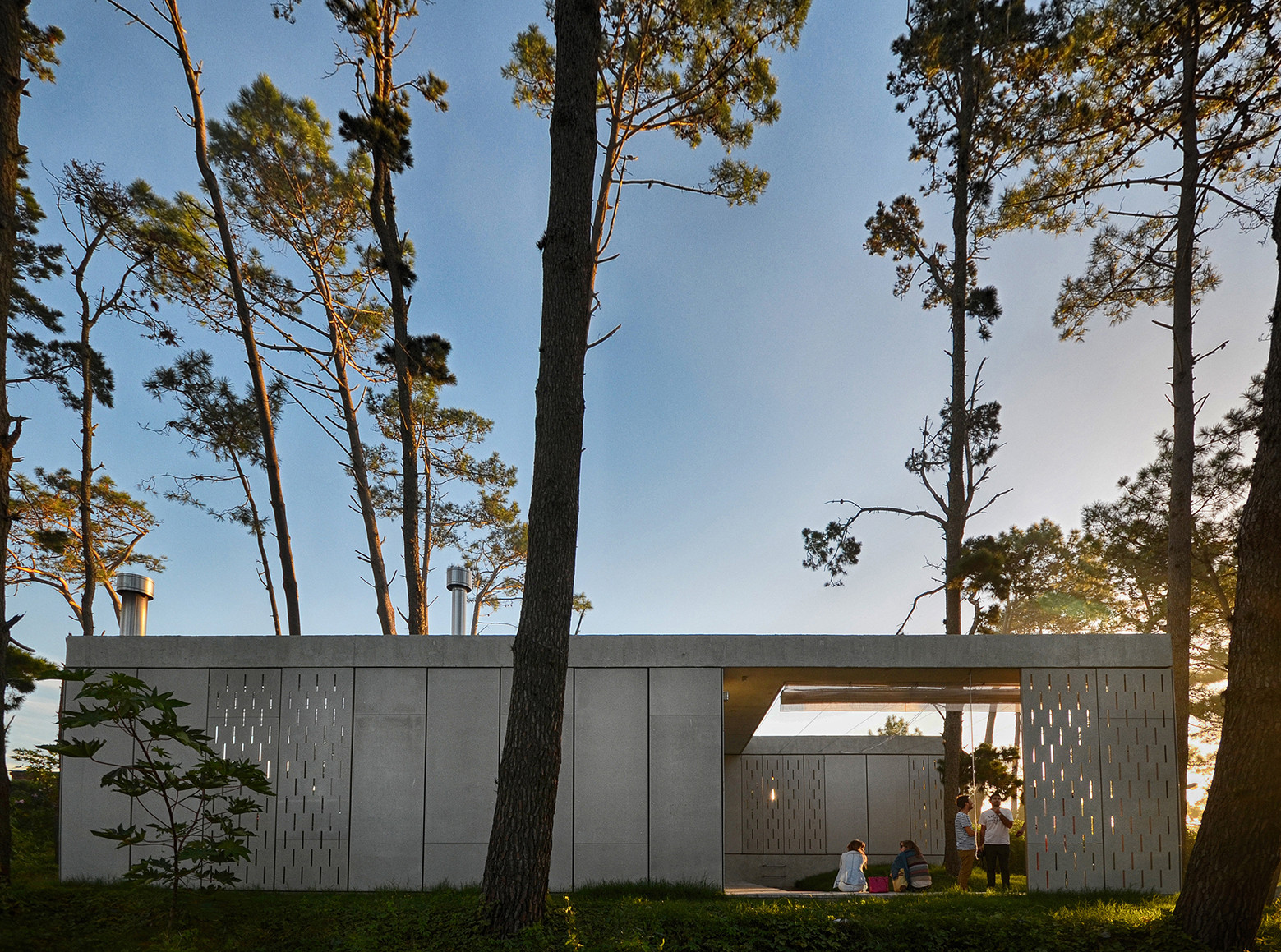 From a space phenomenology perspective, its sensible perforations constitute a haptic quality regarding air quality and light. From the inside, a series of perforations as a veil, reveal nuanced landscape dynamics. From the outside, they generate a cloak that both hides and shows a serene, stressed out domestic activity.