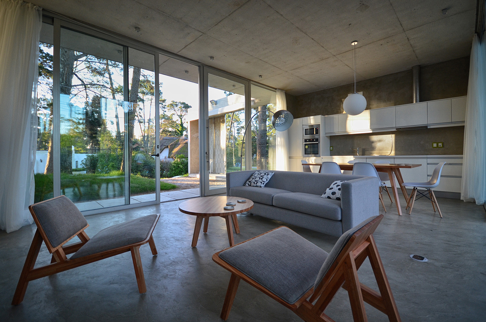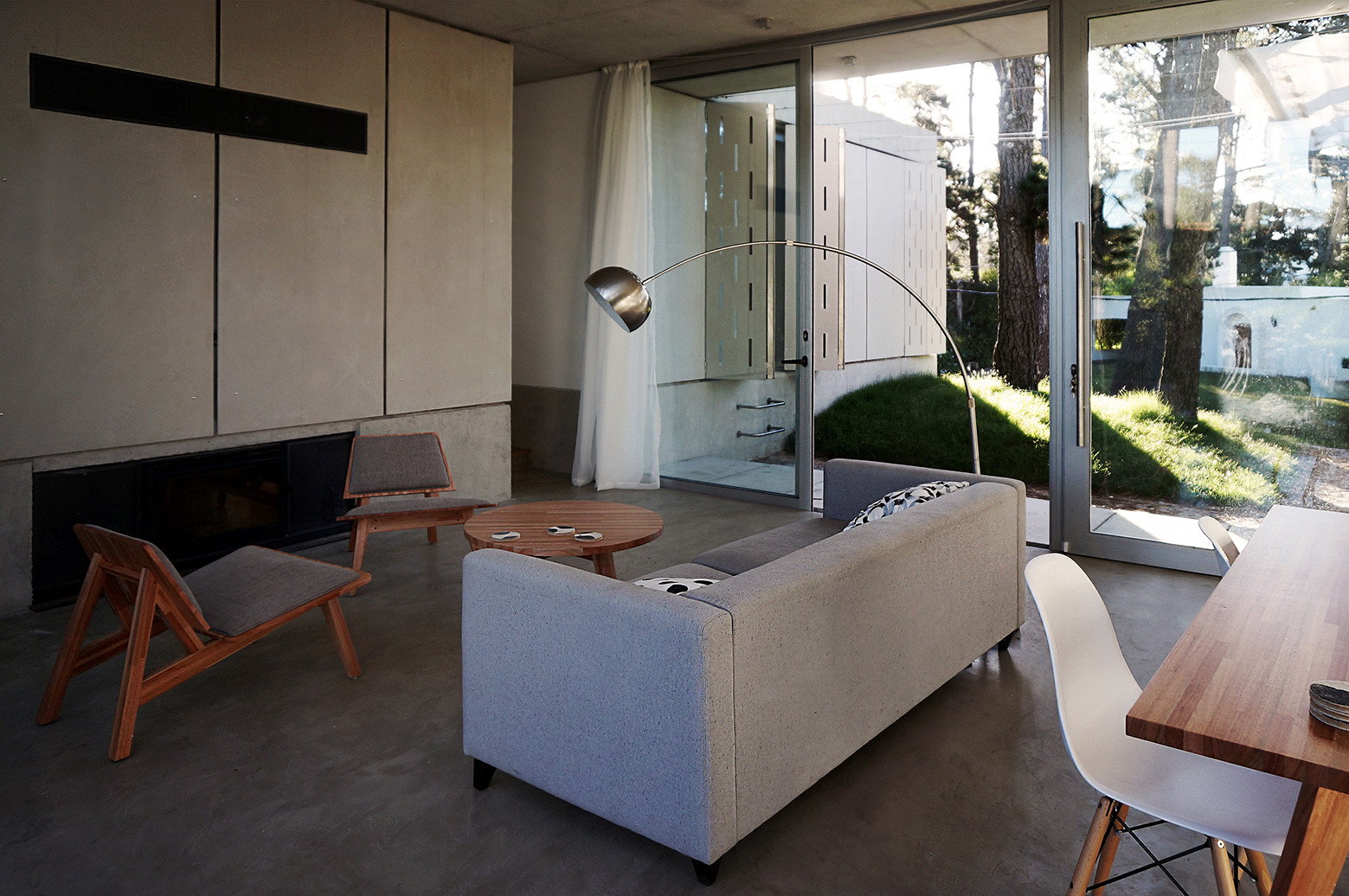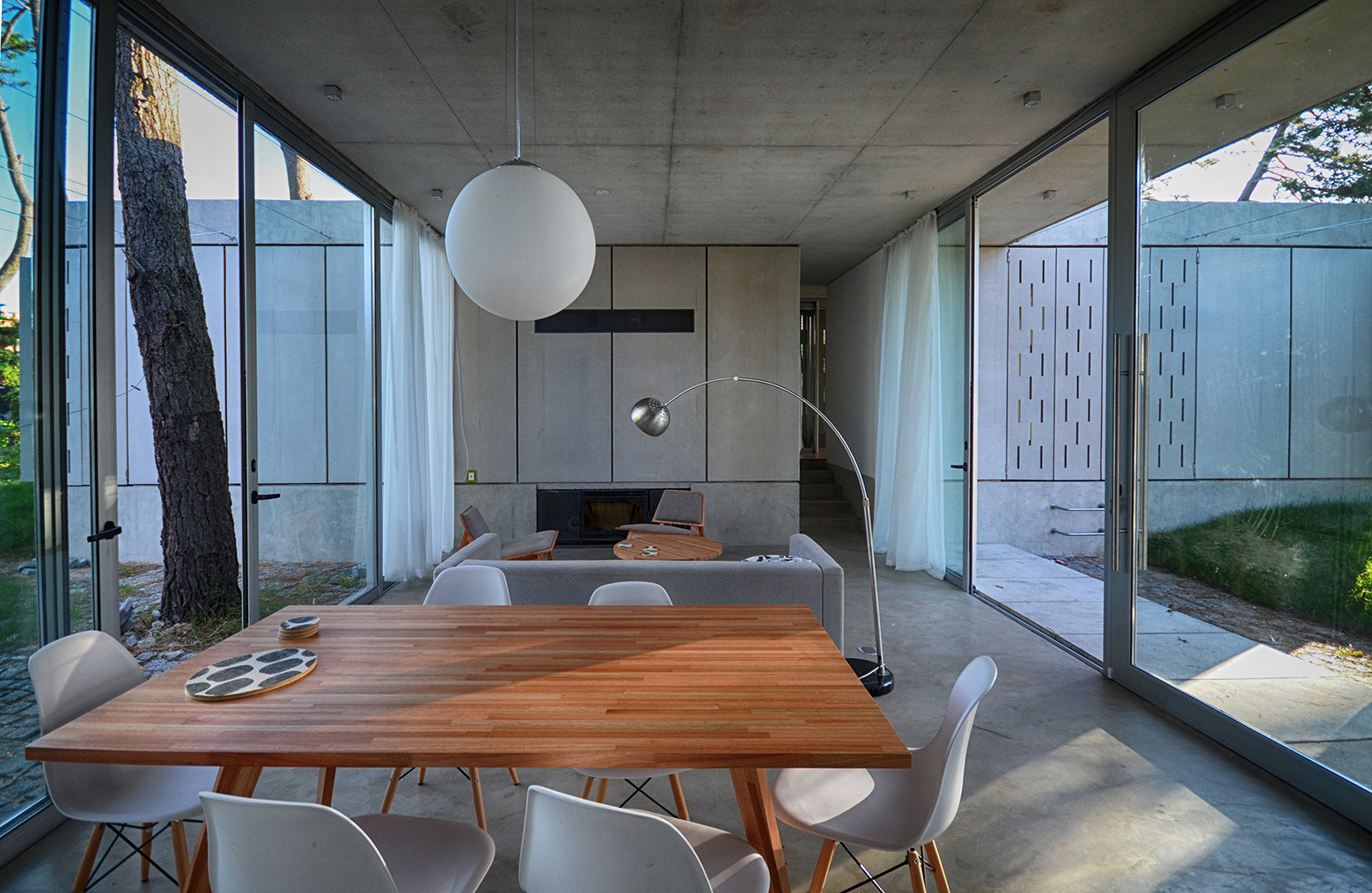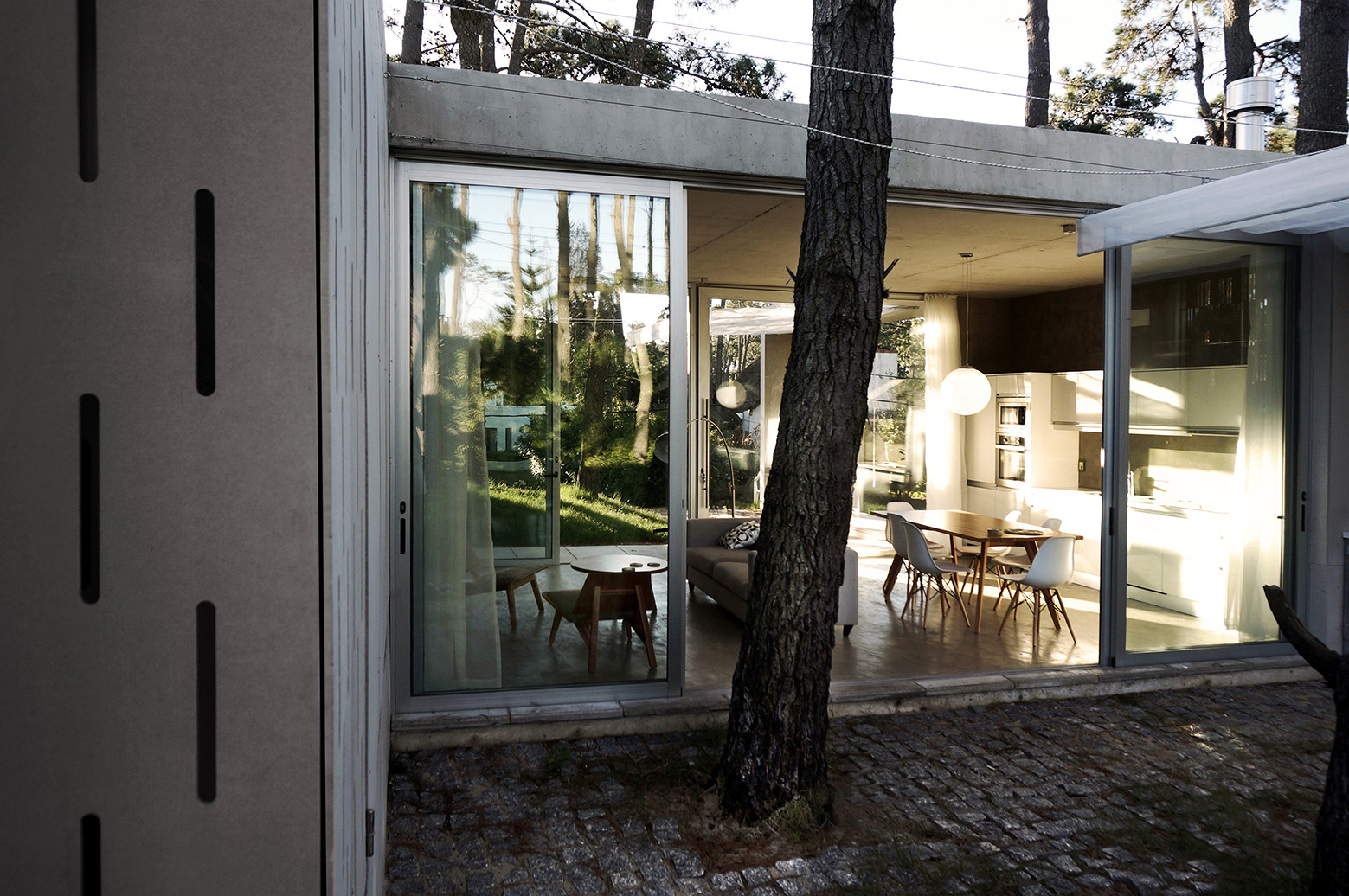The residence features a contemporary design based on rough, durable elements inside and out. Its perforated-ventilated façade ensures passive cooling and goes a long way towards minimizing overall energy consumption. The living room enjoys plenty of natural light and is connected to an outdoor courtyard thanks to a series of sliding glass doors that also fade the limits between the indoors and outdoors.