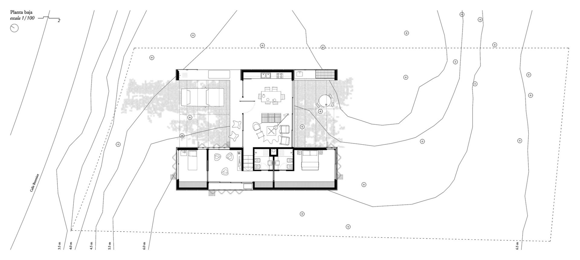 Its asymmetric “H” typology outlines two outdoor patios, overlooked by the rooms, providing a big relation space. Meanwhile, the topography invades its surface, blurring the boundary between a projected exterior and a natural outside. A deploying inhabitable device takes the intimate life to the nature, and incorporates the ambient domain to its interior.