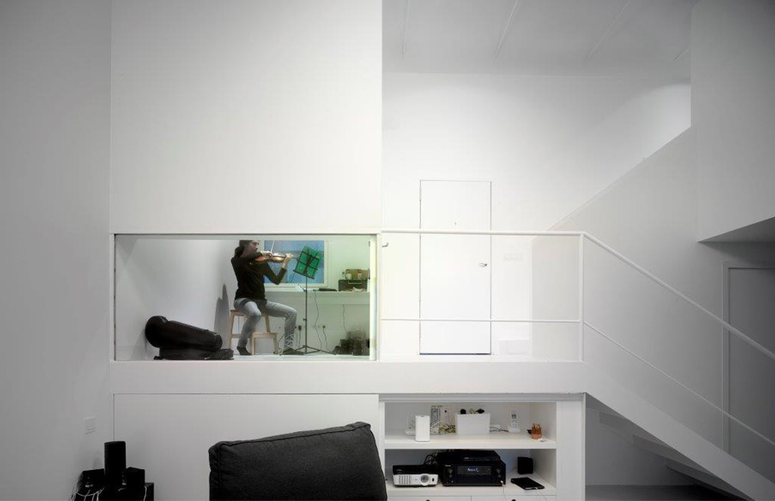 In terms of architecture, this continuity condition, with which the space articulates itself without breaks or interruptions, was a client straightforward goal, a young couple, being she a violinist, with two children.